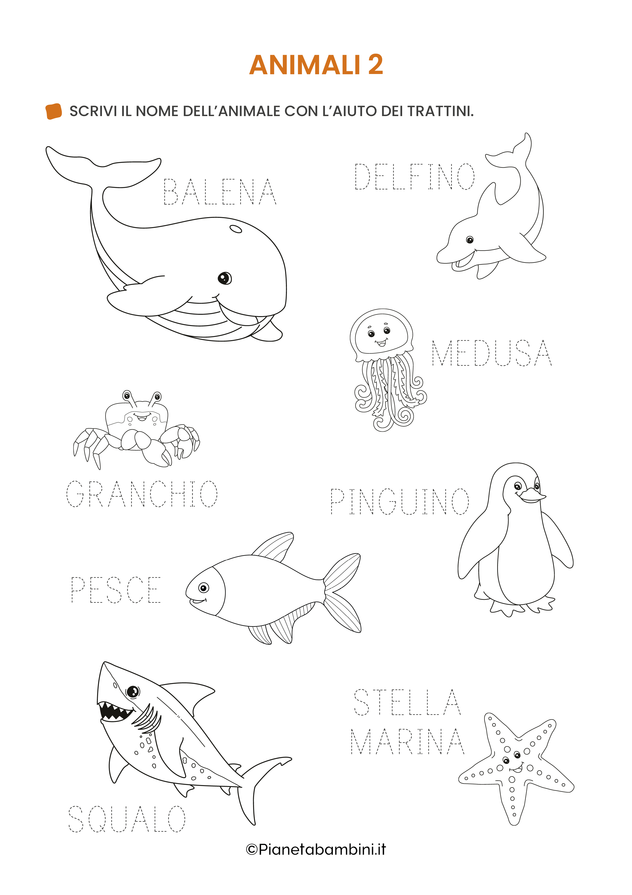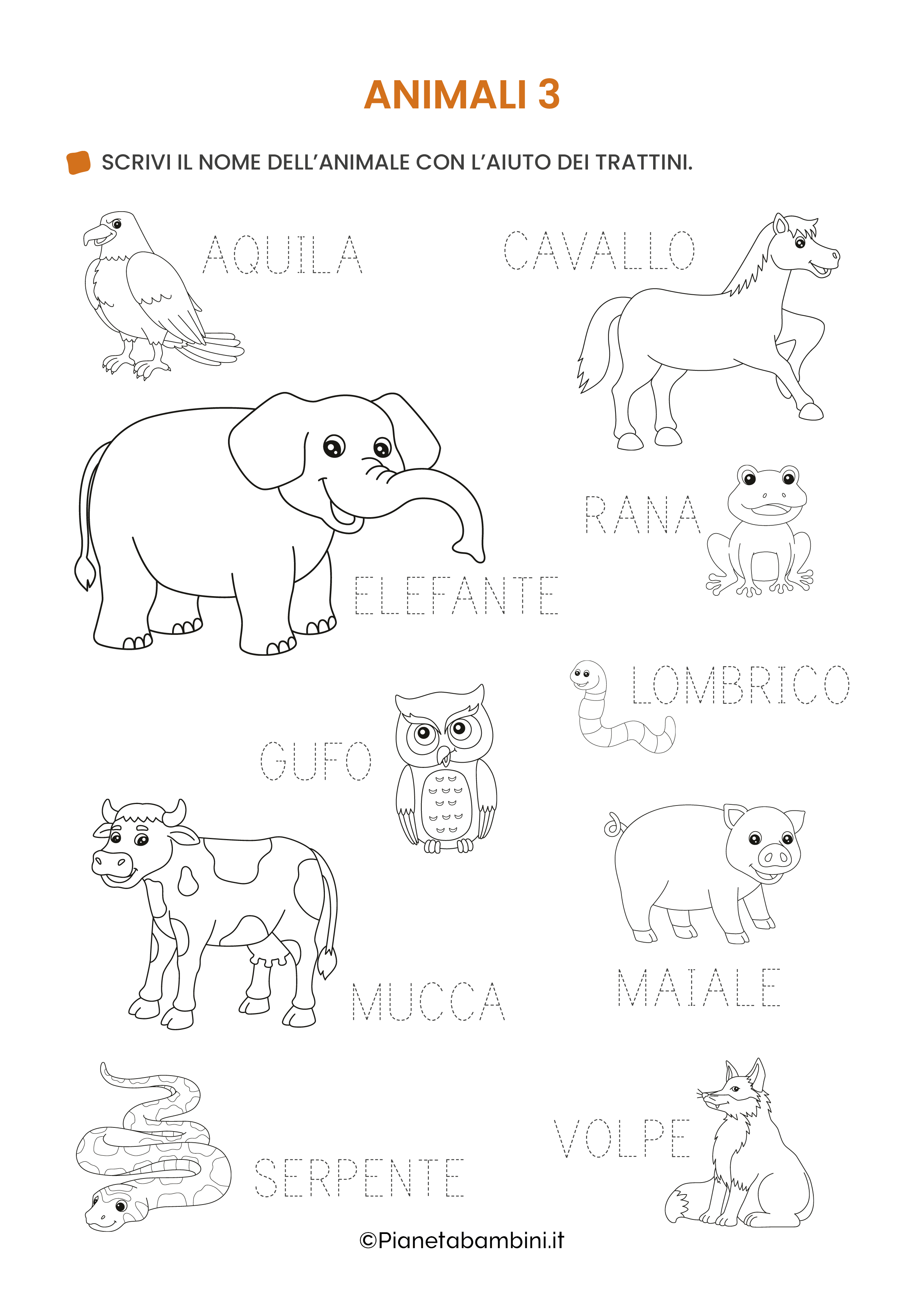 Avrete la possibilità di scaricare tre pagine di esercizi che vanno ad associare all’immagine di diversi animali il nome corrispettivo in forma tratteggiata da completare. I bambini andranno così ad associare testo e immagini memorizzando i nomi di tantissimi animali, da quelli domestici agli animali marini, passando per animali della fattoria fino a quelli del bosco. Per completare l’attività potrete inoltre invitare i bambini a colorare i disegni una volta svolto l’esercizio.