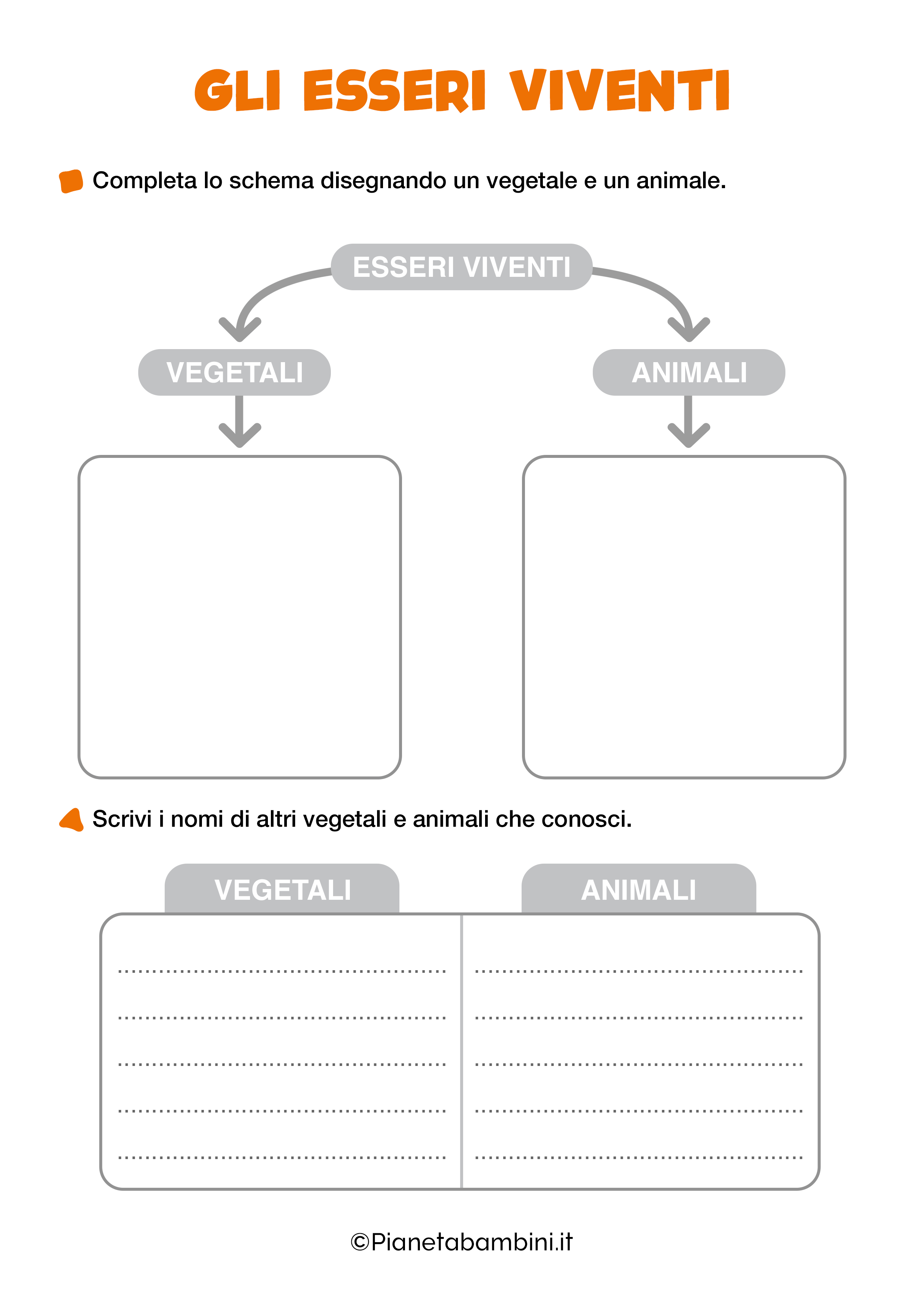 Troverete tre pagine di esercizi, nella prima verrà chiesto di distinguere i vegetali dagli animali, poi si ci confronterà con i cicli vitali di ognuno di essi utilizzando degli schemi da completare scrivendo nei cartellini la fase corrispondente.