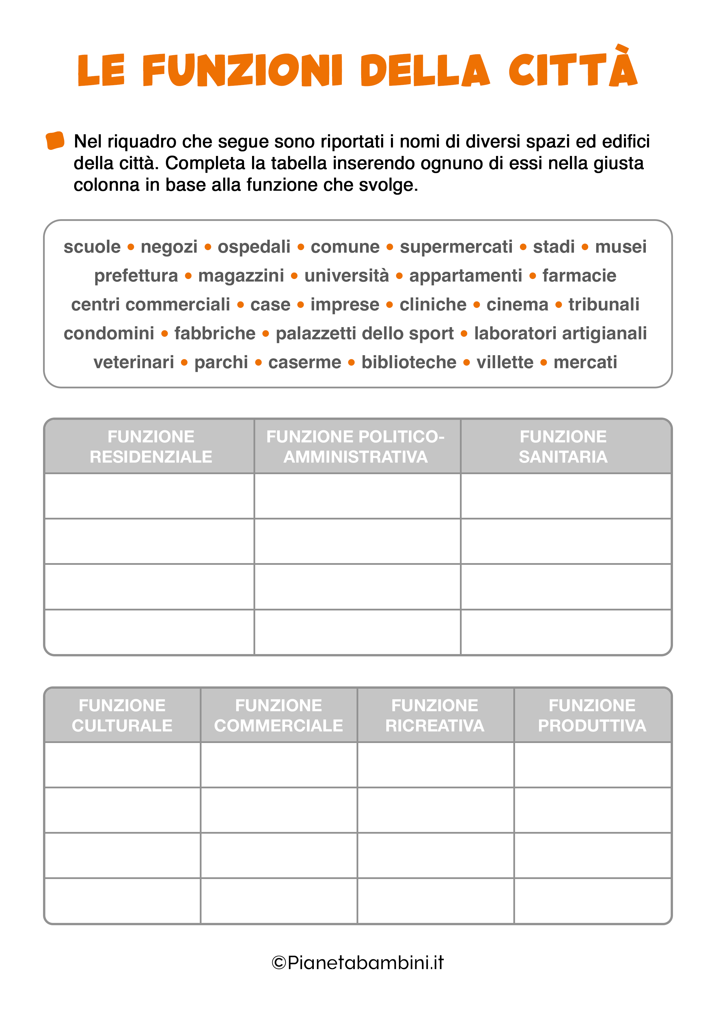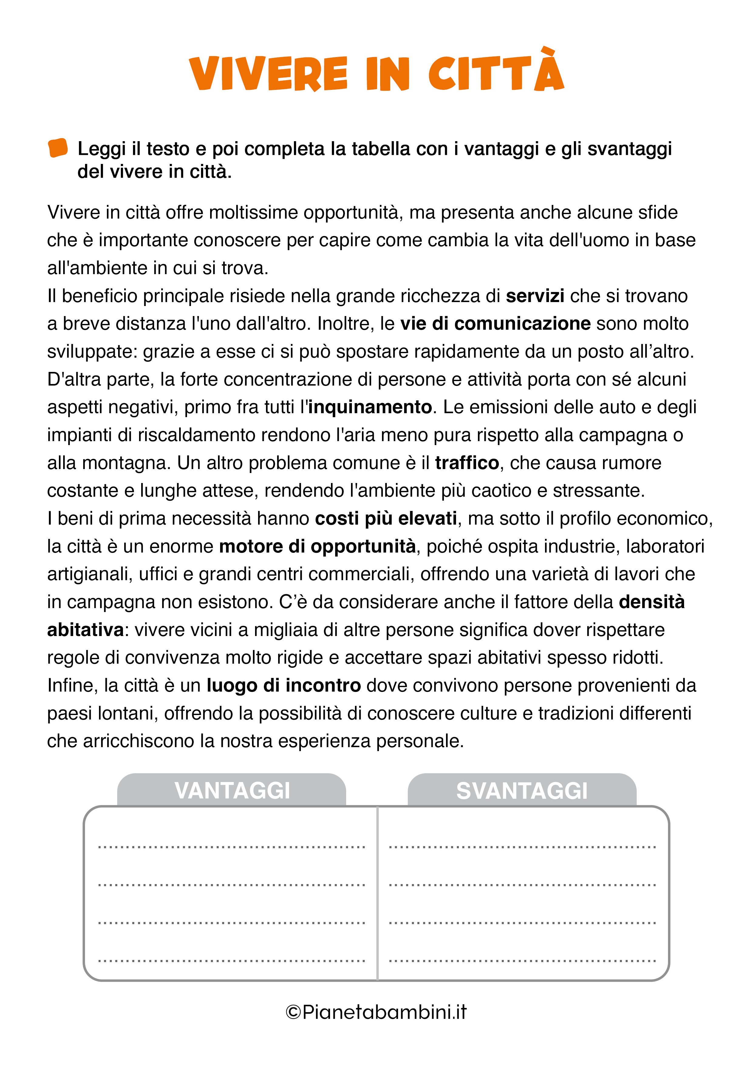 Quelle che troverete sono tre pagine di esercizi che aiuteranno i bambini nello studio degli ambienti e, in particolare, di quello cittadino con la sua struttura, le sue funzioni, vantaggi e svantaggi da identificare e analizzare.