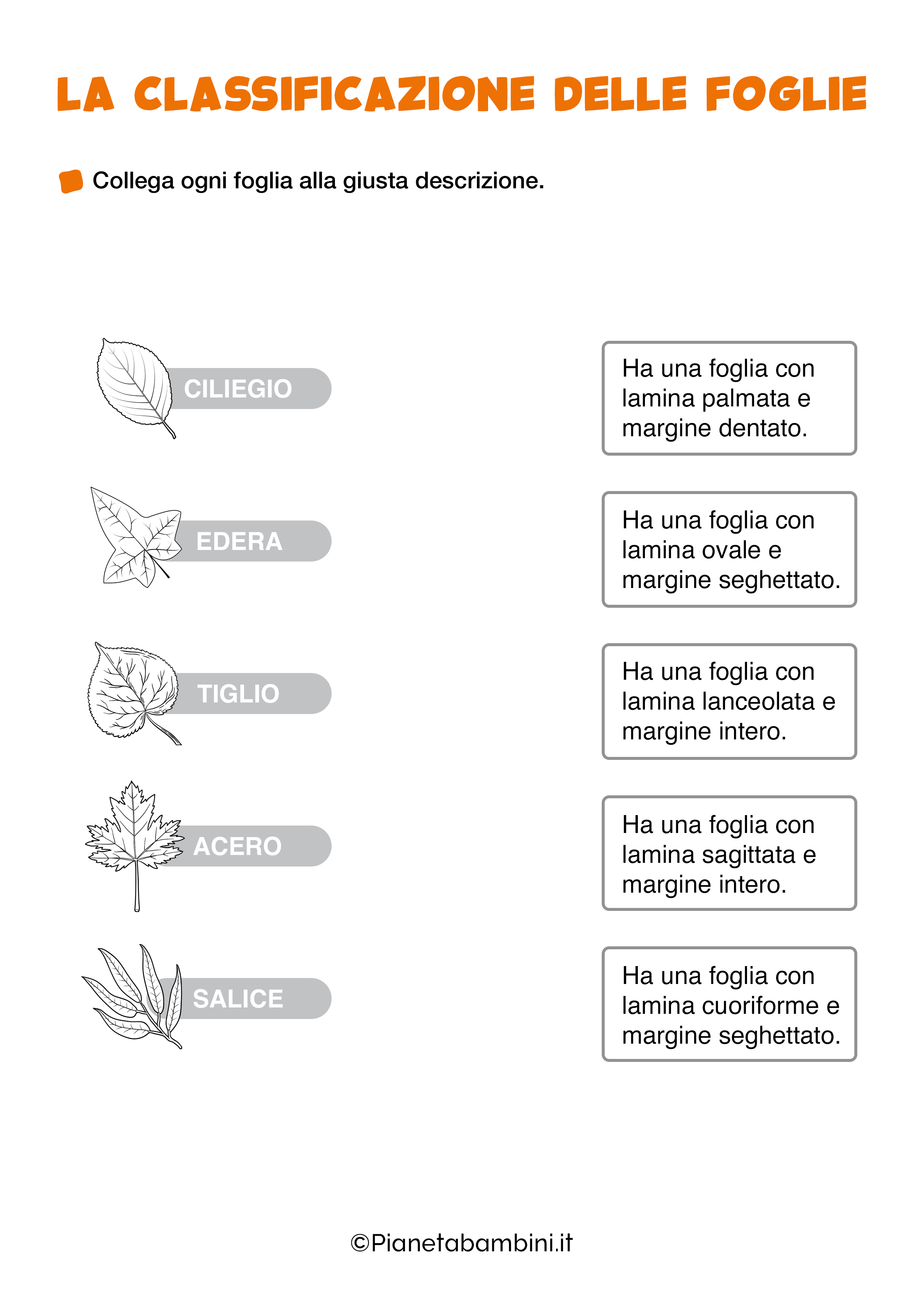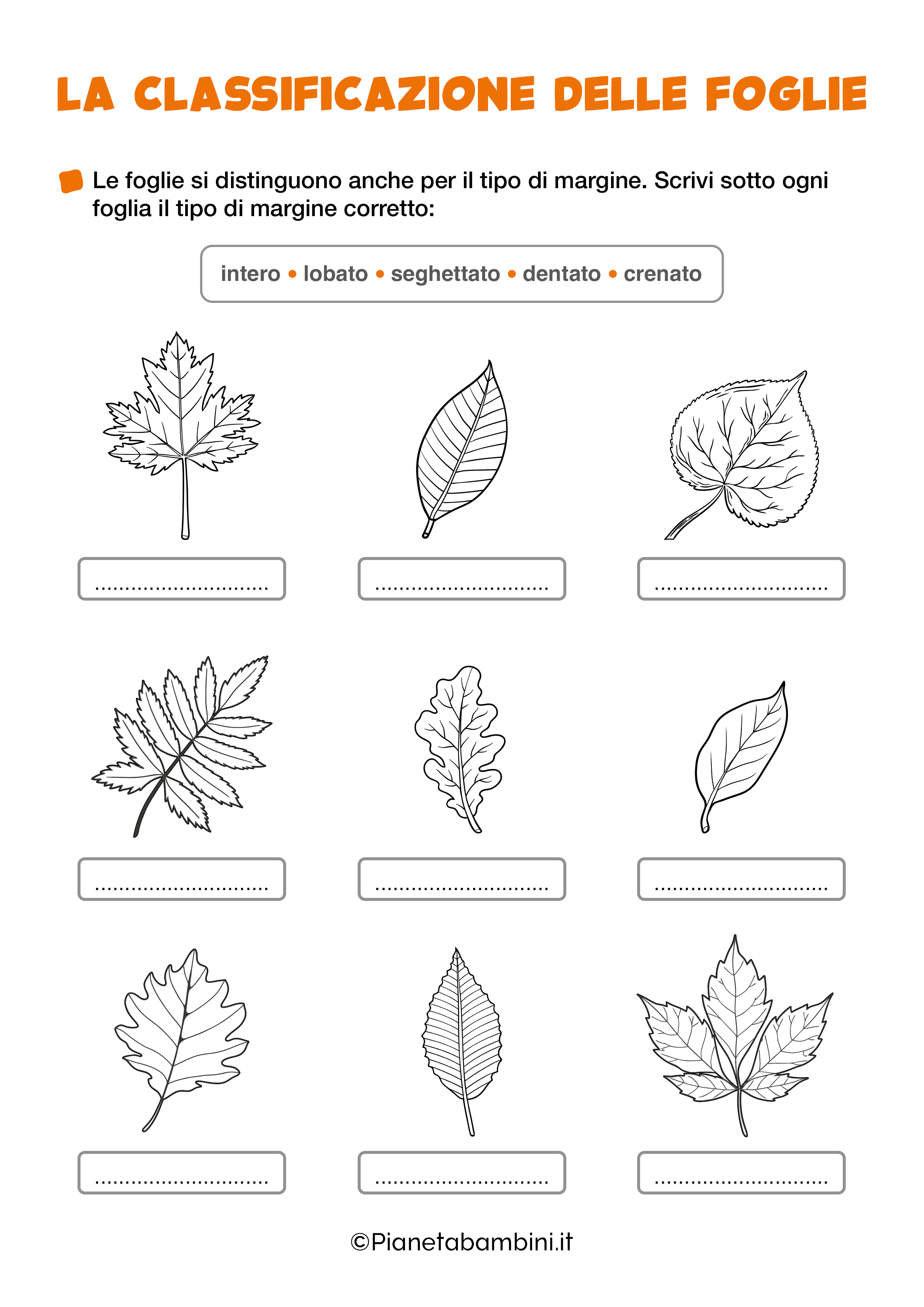 Dopo aver guidato i bambini alla scoperta del mondo vegetale, potrete mettere alla prova il loro apprendimento tramite queste schede di esercizi incentrati sulla classificazione delle foglie: i piccoli scolari dovranno individuare le diverse forme delle foglie, quindi distinguere tra ovali, rotonde, cuoriforme, lanceolate, palmate, sagittate, lineari ed aghiformi; individuare il tipo di margine, che può essere seghettato, intero, dentellato, lobato o crenato; infine riconoscere le foglie di piante sempreverdi da quelle caducifoglie.