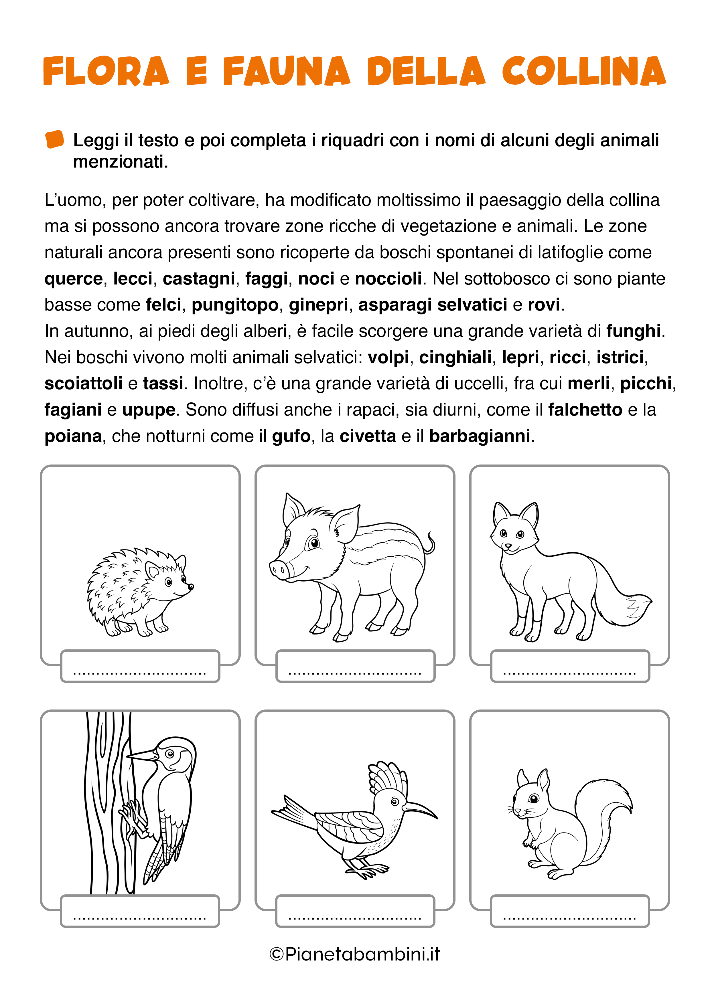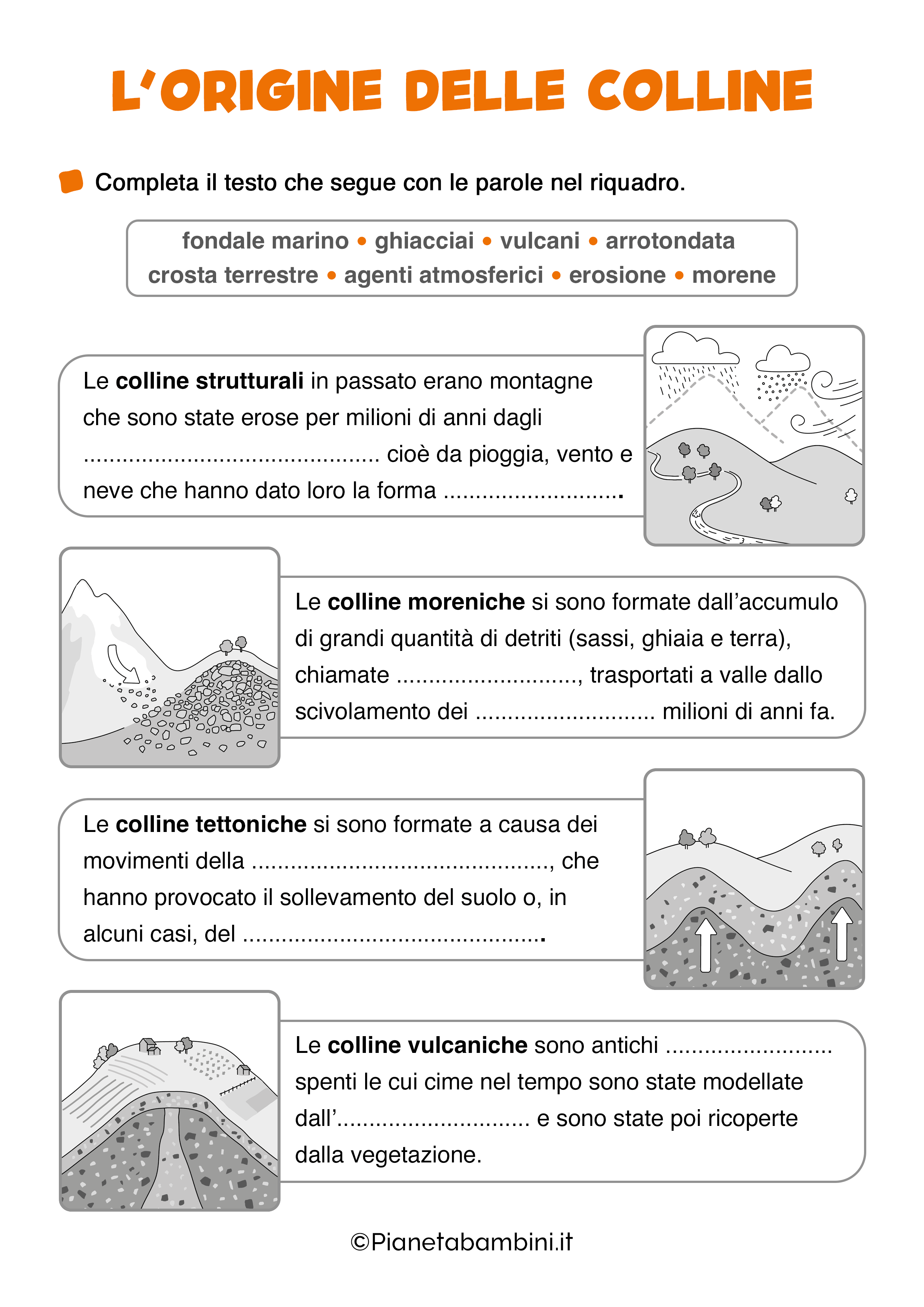 In particolare troverete un esercizio sulle definizioni relative alla collina, un testo da completare dedicato ai quattro processi di origine e formazione delle colline, una tabella da completare identificando ed inserendo i nomi di piante e animali che popolano questo ambiente, una serie di affermazioni da definire come vere oppure false, una serie di informazioni da collegarsi alla montagna oppure alla collina, ed infine una utilissima mappa concettuale riepilogativa.