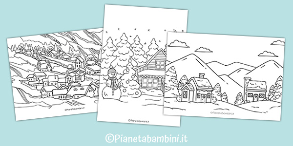 Eccovi dei meravigliosi disegni di paesaggi invernali che i vostri piccoli potranno decorare in assoluta libertà dando libero sfogo alla fantasia.