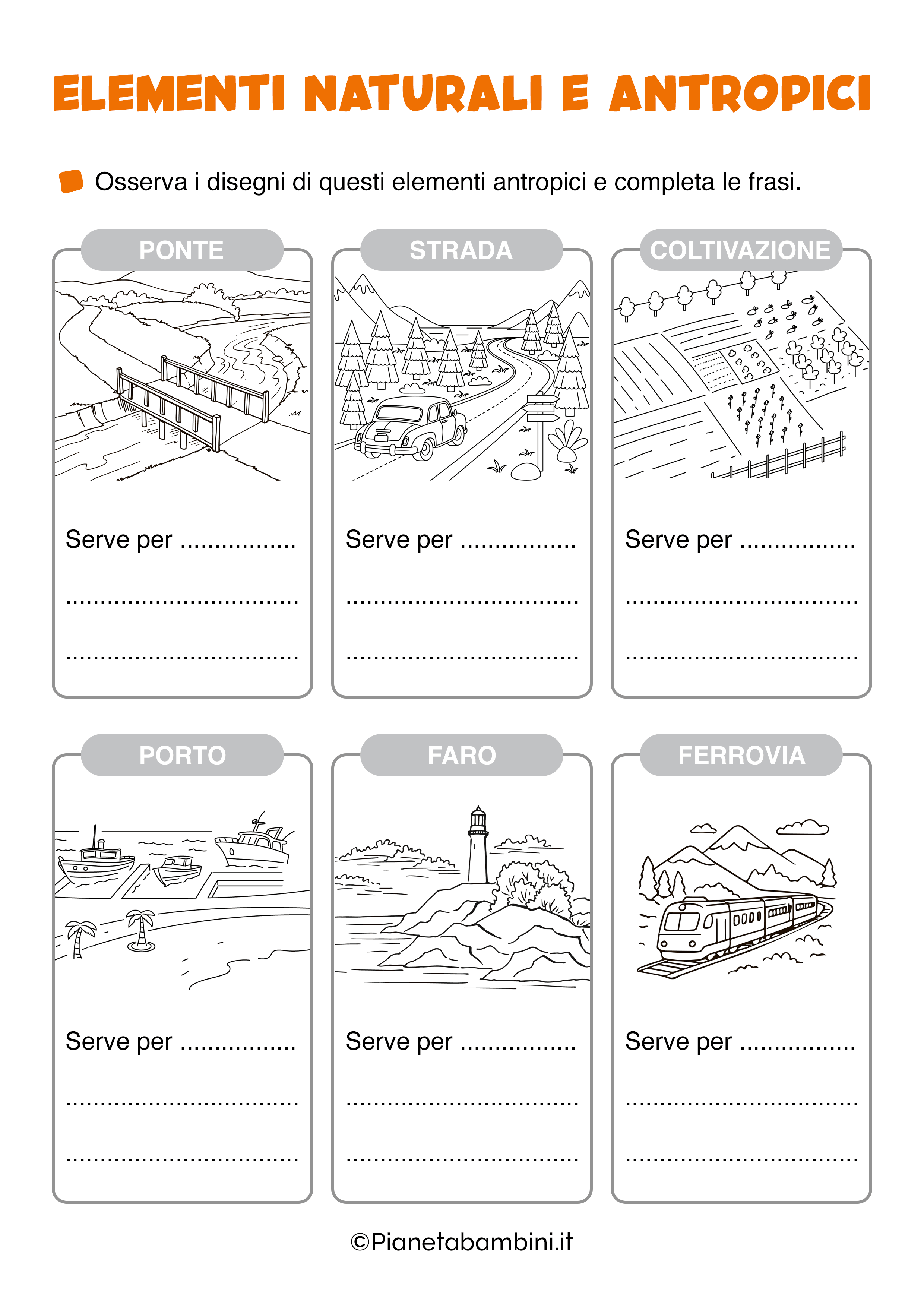 Nell’osservare i paesaggi che li circondano i bambini avranno modo di riflettere sulla distinzione tra quelli che sono gli elementi naturali del territorio, ossia che ne fanno parte indipendentemente dall’intervento dell’uomo, e gli elementi antropici (o artificiali), realizzati invece proprio dall’uomo per scopi ben precisi. Per aiutarli a meglio comprendere tali concetti vi metteremo a disposizione delle schede didattiche dedicate proprio agli elementi naturali e antropici realizzate appositamente per gli studenti della seconda classe della Scuola Primaria.