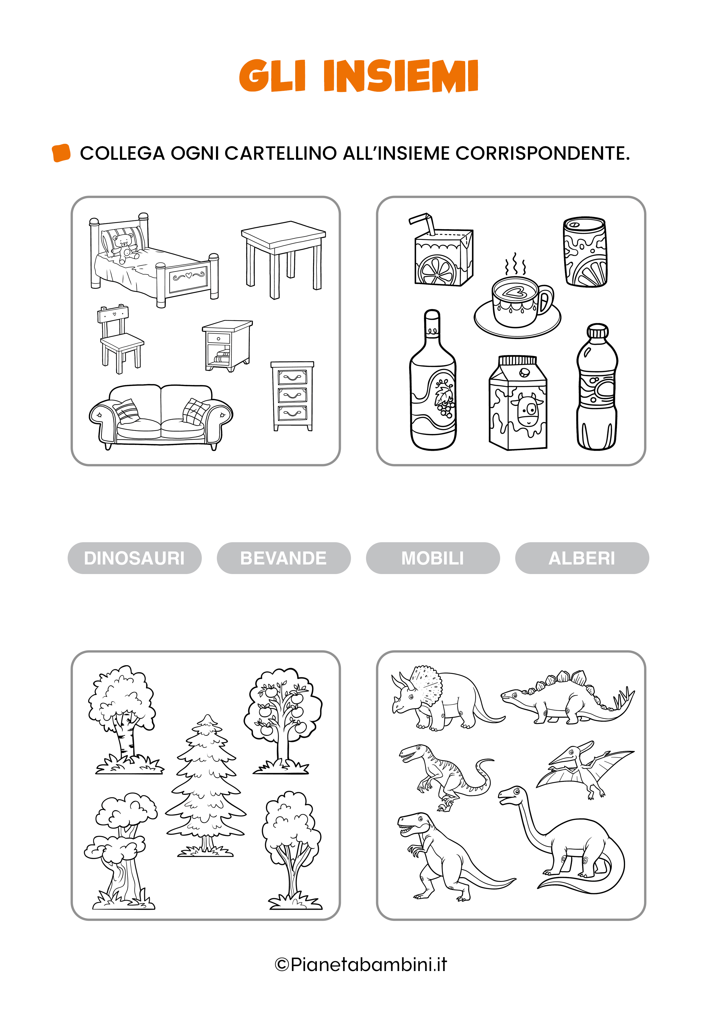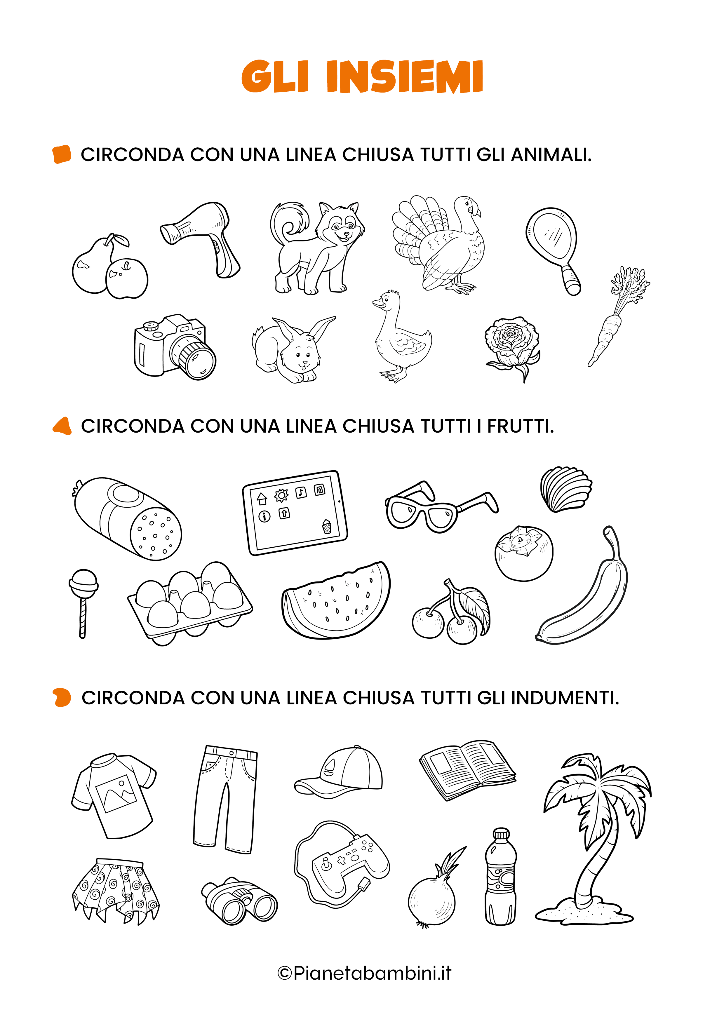 Comprendere il concetto di insieme è di fondamentale importanza per i bambini della classe prima della Scuola Primaria che affrontano i primi concetti matematici e, per aiutarli proprio in questo frangente, vi metteremo a disposizione una raccolta di schede didattiche sugli insiemi sviluppati secondo un livello di difficoltà crescente ed a vostra disposizione per la stampa gratuita.