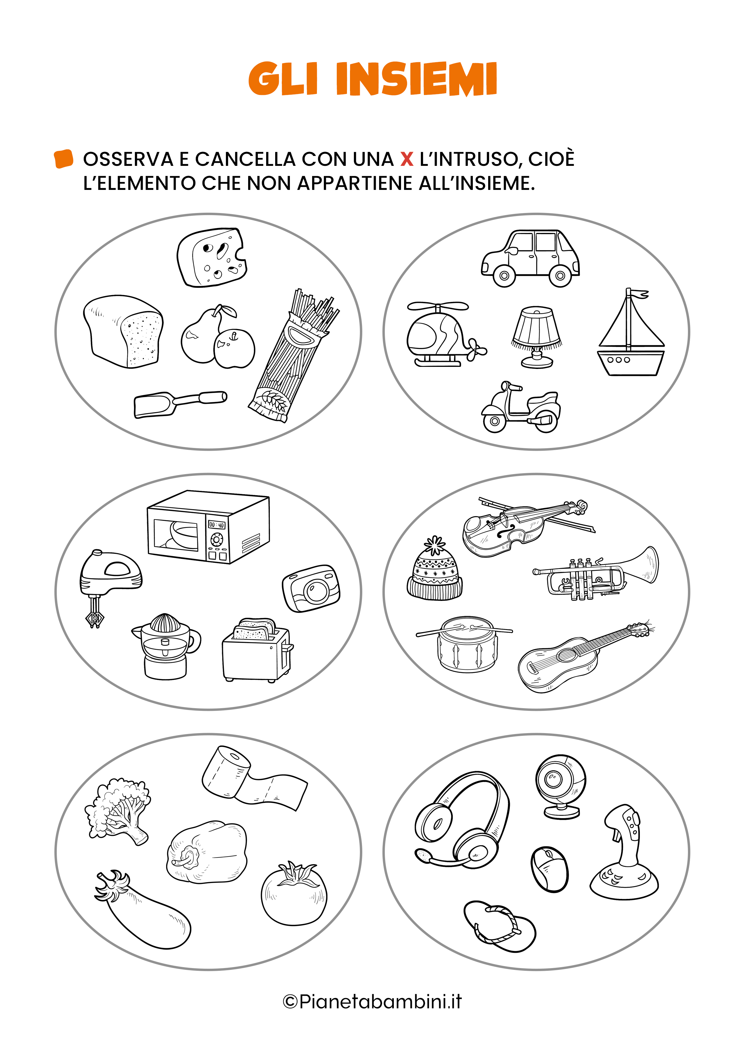 Gli esercizi che abbiamo creato per l’occasione utilizzano i classici diagrammi di Eulero-Venn per la rappresentazione grafica e lo sviluppo logico dell’argomento. Perfetti da proporre in aula oppure a casa come ulteriore approfondimento didattico, gli esercizi richiederanno di contare e scrivere il numero degli elementi presenti in diversi insiemi, creare un diagramma che contenga solo gli elementi richiesti, definire il tipo di insiemi a seconda dei loro contenuti, sbarrare l’elemento estraneo ad un dato insieme, disegnare gli elementi di un serie di insiemi e, infine, completare gli insiemi disegnando al loro interno almeno un elemento che ne faccia parte.