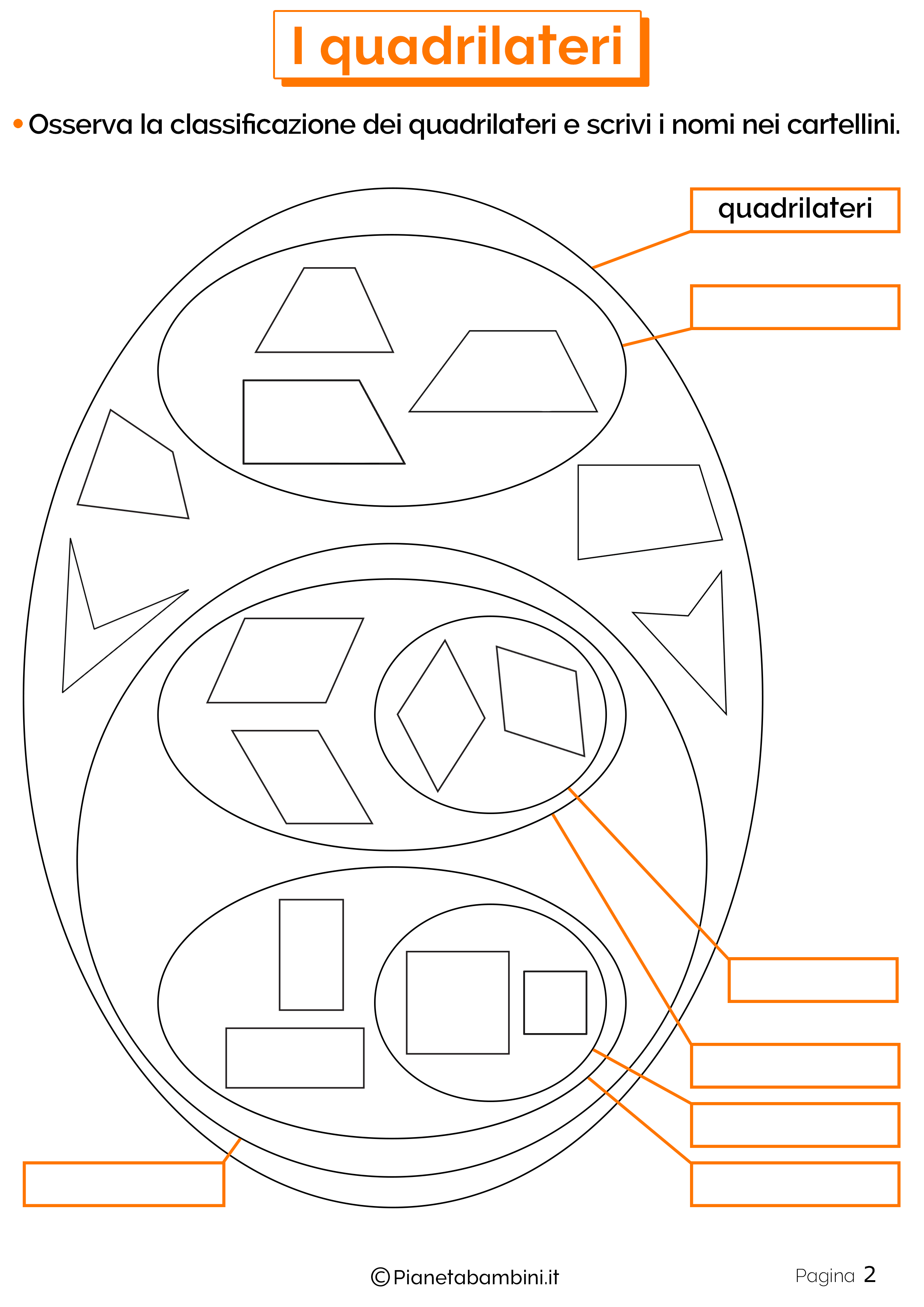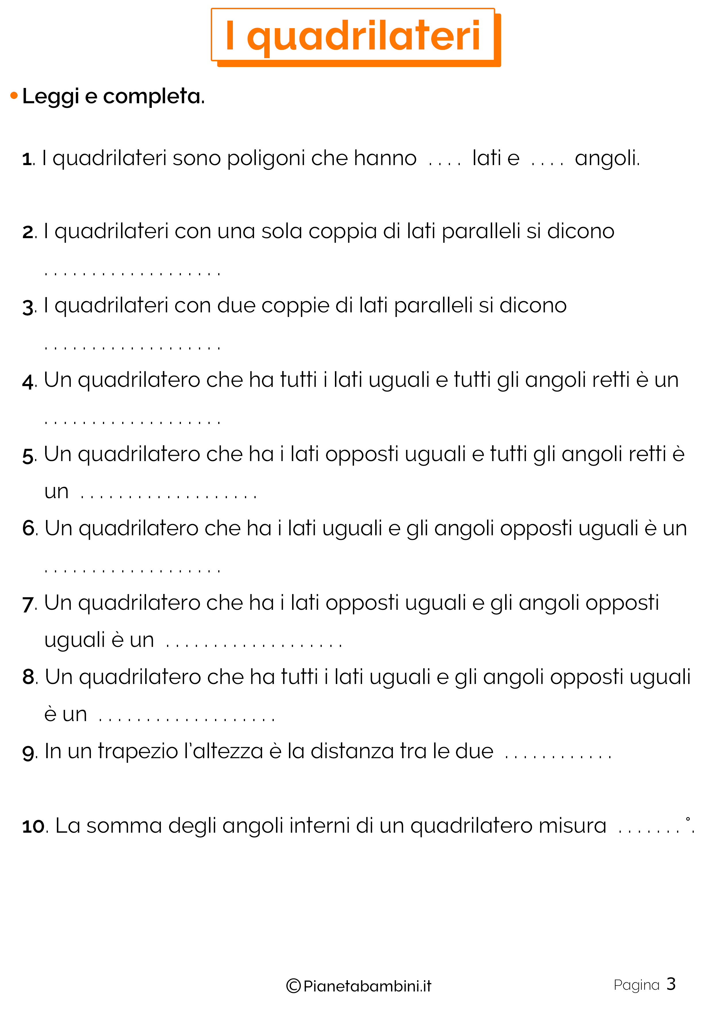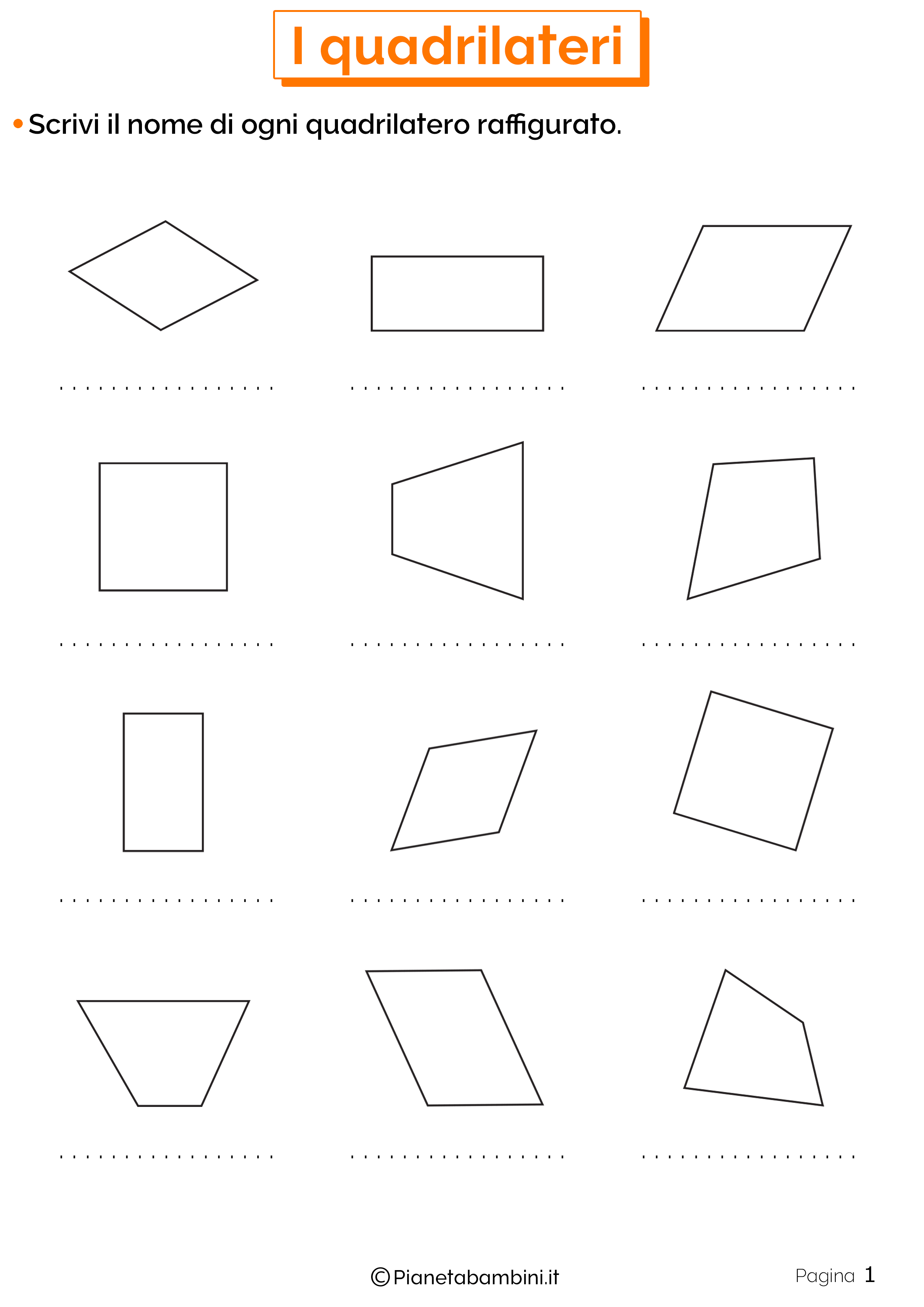Qui potrete infatti stampare gratis tre pagine di esercizi sui quadrilateri perfetti per i vostri bambini: per prima cosa dovranno identificare i nomi di diversi quadrilateri, poi la loro classificazione ed infine dovranno completare una serie di affermazioni relative proprio a proprietà e caratteristiche dei quadrilateri.