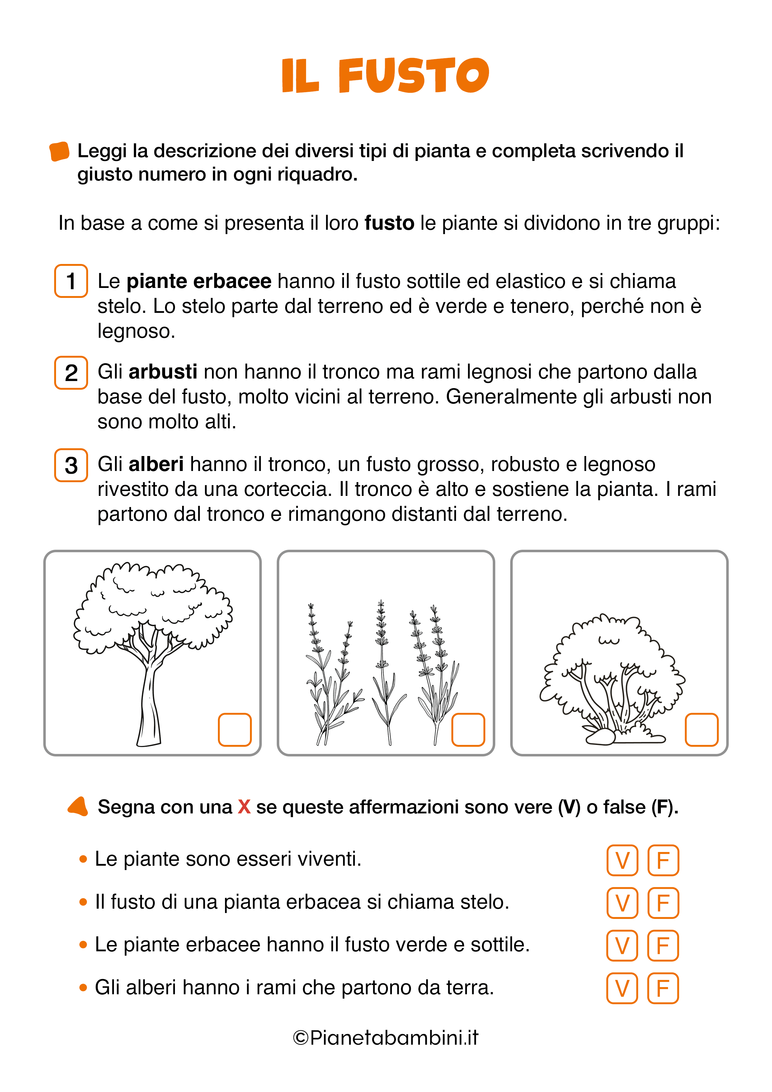 Tutto il materiale didattico qui proposto, quindi teoria ed esercizi, guiderà i bambini alla scoperta del fusto delle piante, quindi della parte che si sviluppa al di fuori del terreno ed ha il compito di sostenere e trasportare i nutrimenti tramite degli appositi vasi, delle varie classificazioni e quindi della divisione in categorie e sottocategorie andando dai tre tipi di fusti erbacei (divisi in stelo, culmo e scapo) al fusto grosso, volubile e sotterraneo che varia a sua volta in rizomi, bulbi e tuberi.