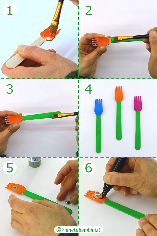 Come sicuramente avrete già intuito, per trasformare le nostre forchette di legno in eleganti tulipani andremo per prima cosa a dargli colore e lo faremo dipingendo con del colore acrilico arancione, blu e viola la parte dei rebbi (fig. 1) e con dell’acrilico verde il manico (fig. 2). Dovrete ottenere un risultato come quello mostrato in fig. 4, quindi tre versioni diverse di tulipani colorati. Aggiungiamo gli occhi finti (fig. 5) e con un pennarello disegniamo la bocca (fig. 6).
