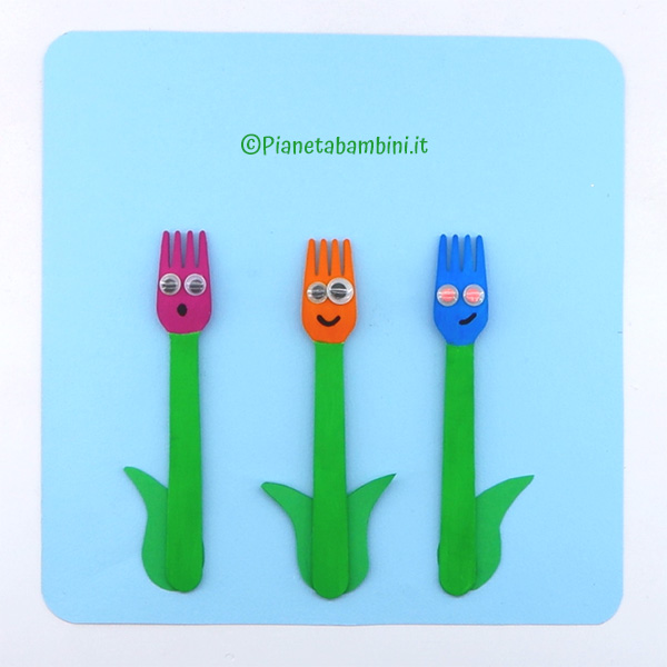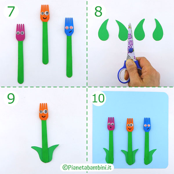 Naturalmente potrete personalizzare i fiori come desiderate, noi abbiamo scelto espressioni e tipologie di occhi differenti (fig. 7). Passiamo ora alla creazione delle foglie che andranno sagomate e ritagliate su un cartoncino di colore verde (fig. 8). Con l’aiuto della colla andranno poi fissate alla base delle nostre forchette così da creare un perfetto stelo (fig. 9). Il lavoretto è terminato, pochi e semplici passaggi per un risultato a dir poco strepitoso!
