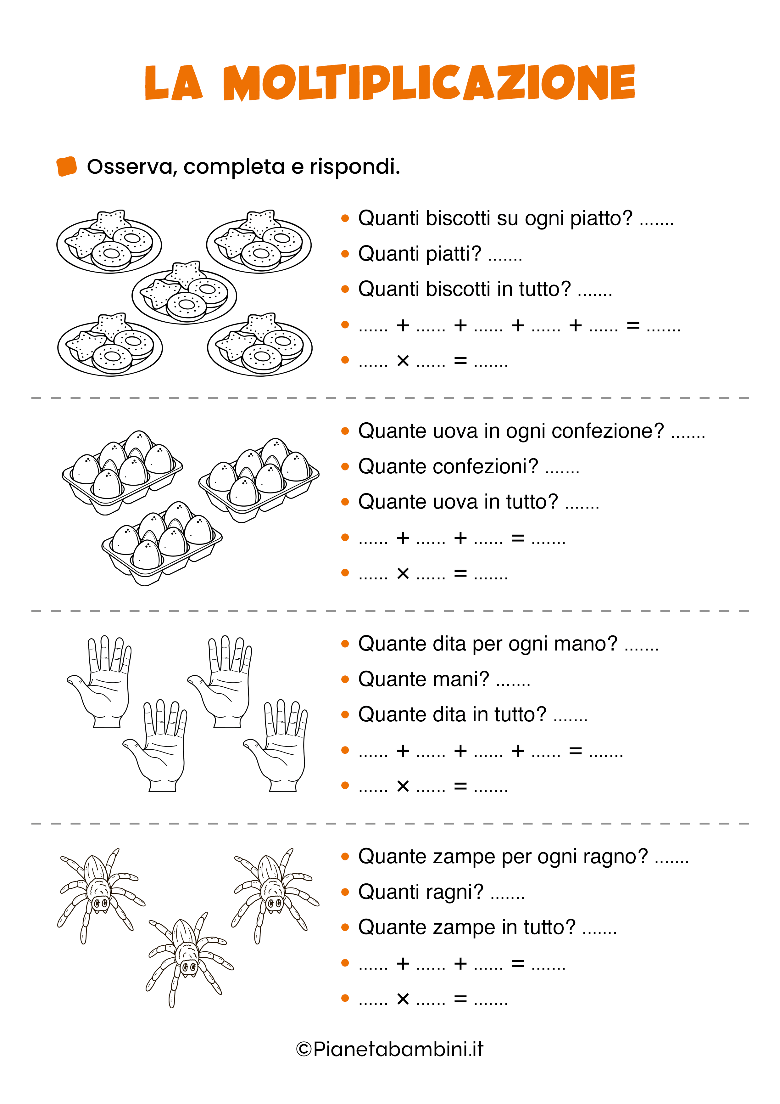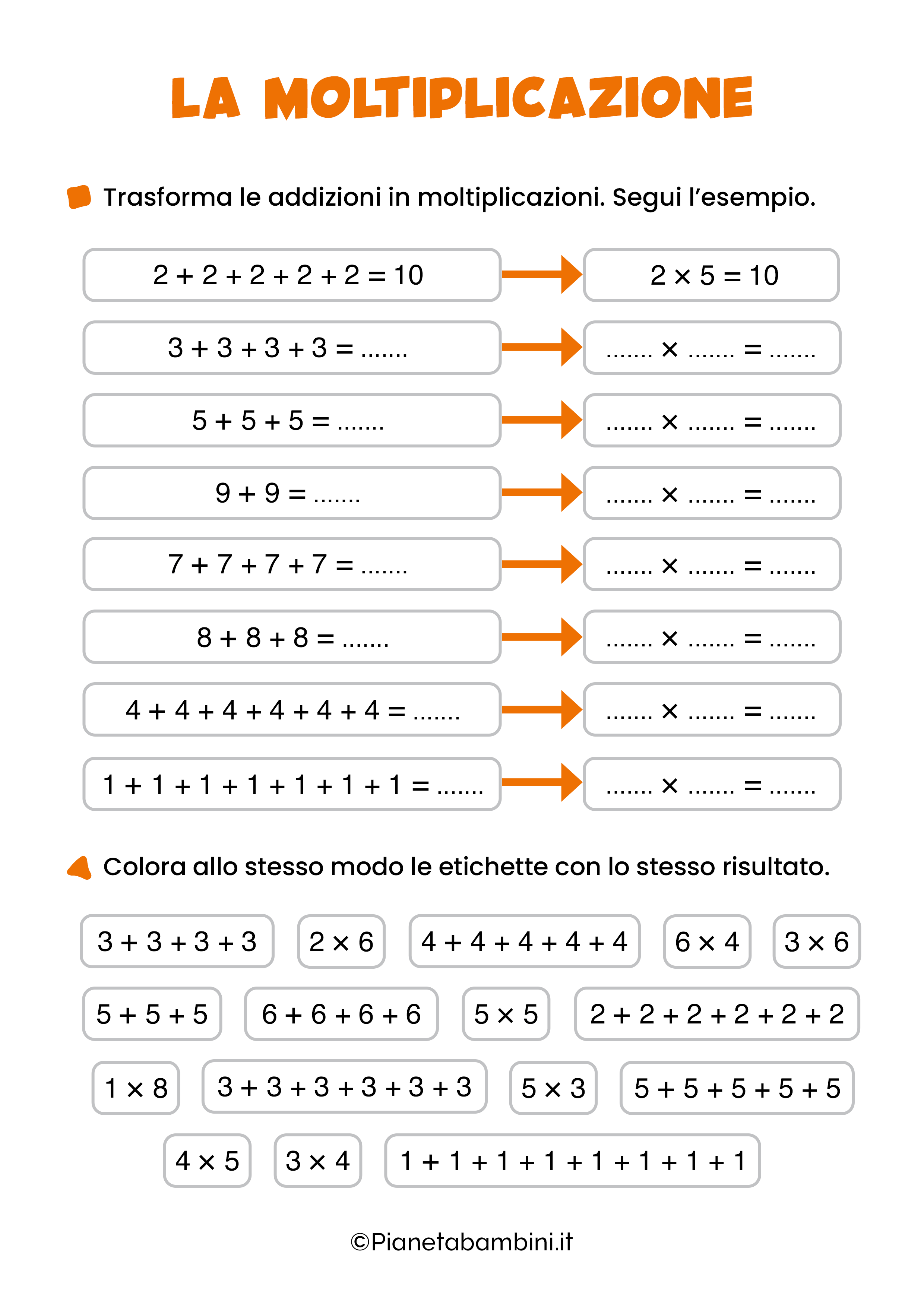 Le schede didattiche sulla moltiplicazione, che potrete stampare gratuitamente oppure consultare online, si concentreranno sulla trasformazione di addizioni con gli addendi tutti uguali in una nuova operazione che è proprio la moltiplicazione. Ai bambini verrà richiesto di sviluppare un’addizione ripetuta per poi scrivere correttamente la moltiplicazione che ne deriva utilizzando il segno × ed identificando moltiplicando e moltiplicatore.