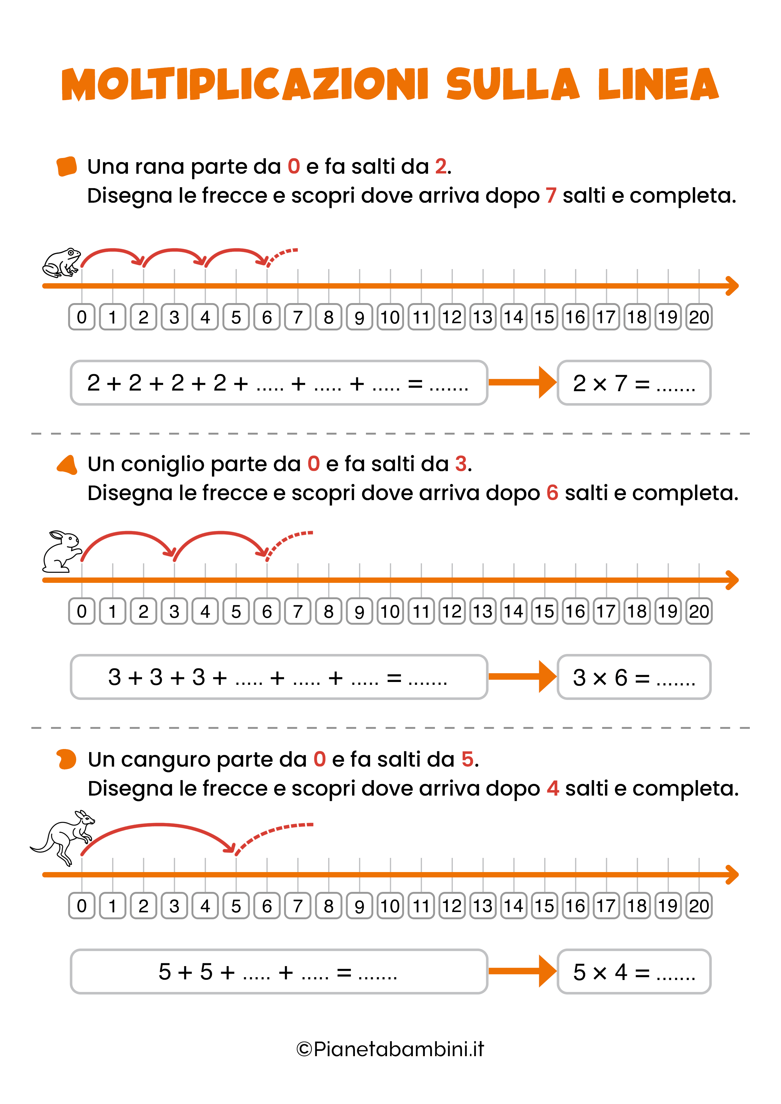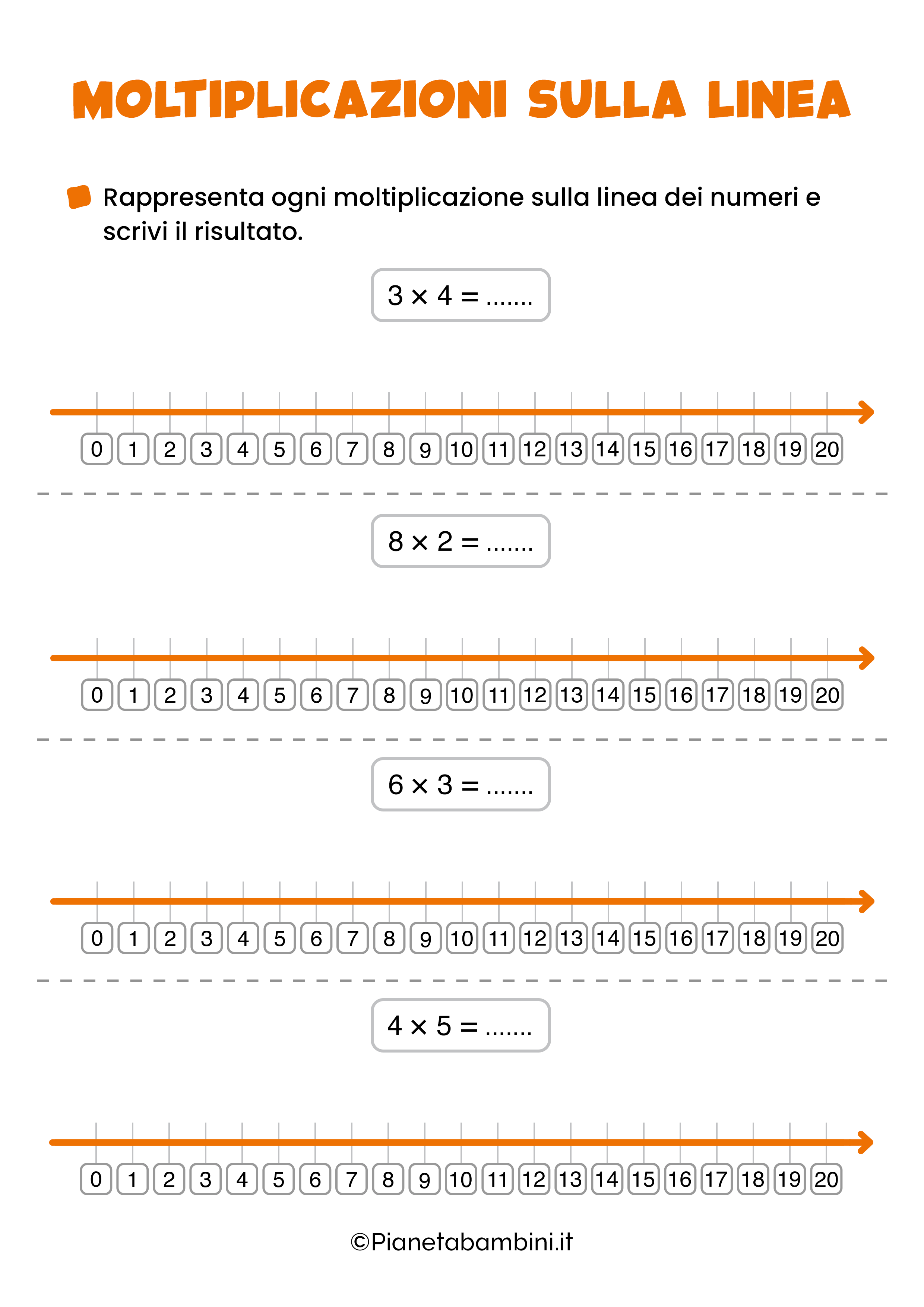 Quelli che qui vi proponiamo sono una serie di esercizi che si riveleranno utilissimi per gli studenti che frequentano la seconda classe della Scuola Primaria e sono alle prese con lo studio delle moltiplicazioni. Vi presentiamo infatti le moltiplicazioni sulla linea, ossia un tipo di risoluzione di questa particolare operazione che aiuterà moltissimo i bambini a focalizzare in maniera pratica i salti da compiere per arrivare al risultato.