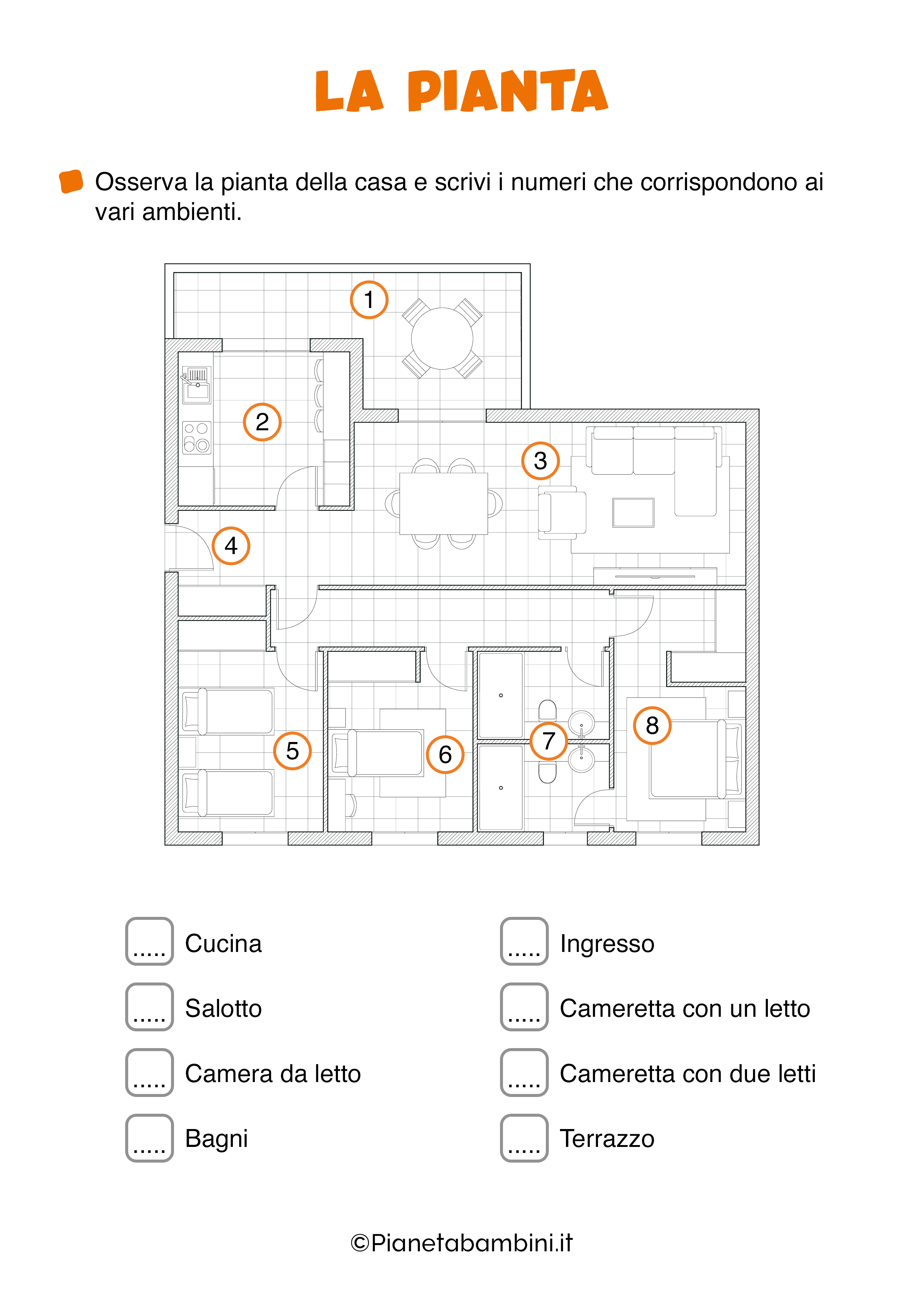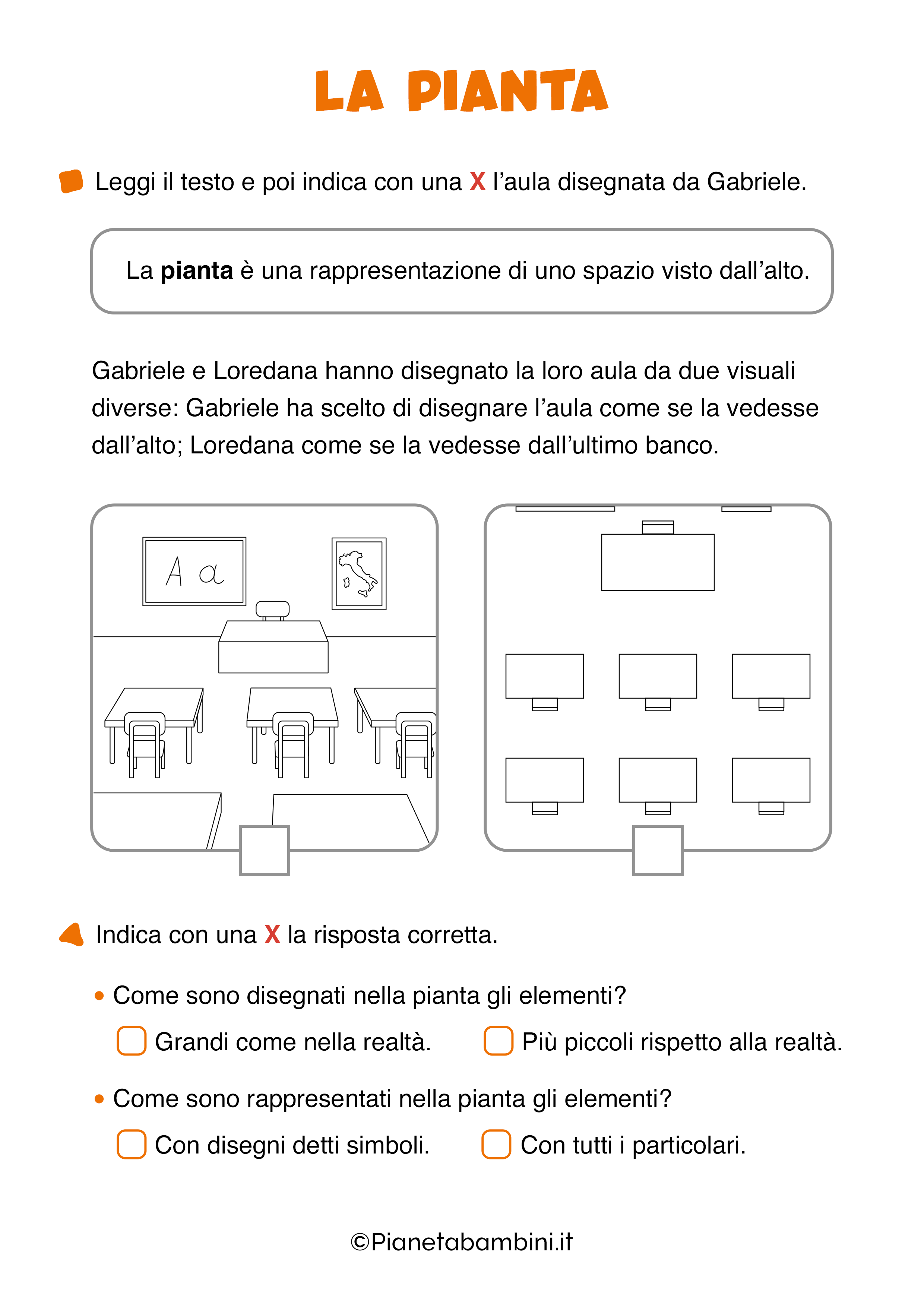 Abbiamo realizzato tre pagine di esercizi che aiuteranno i bambini comprendere il concetto e la funzione della pianta applicandolo a diversi ambienti, dall’aula scolastica, agli spazi della casa fino ad arrivare agli arredi.