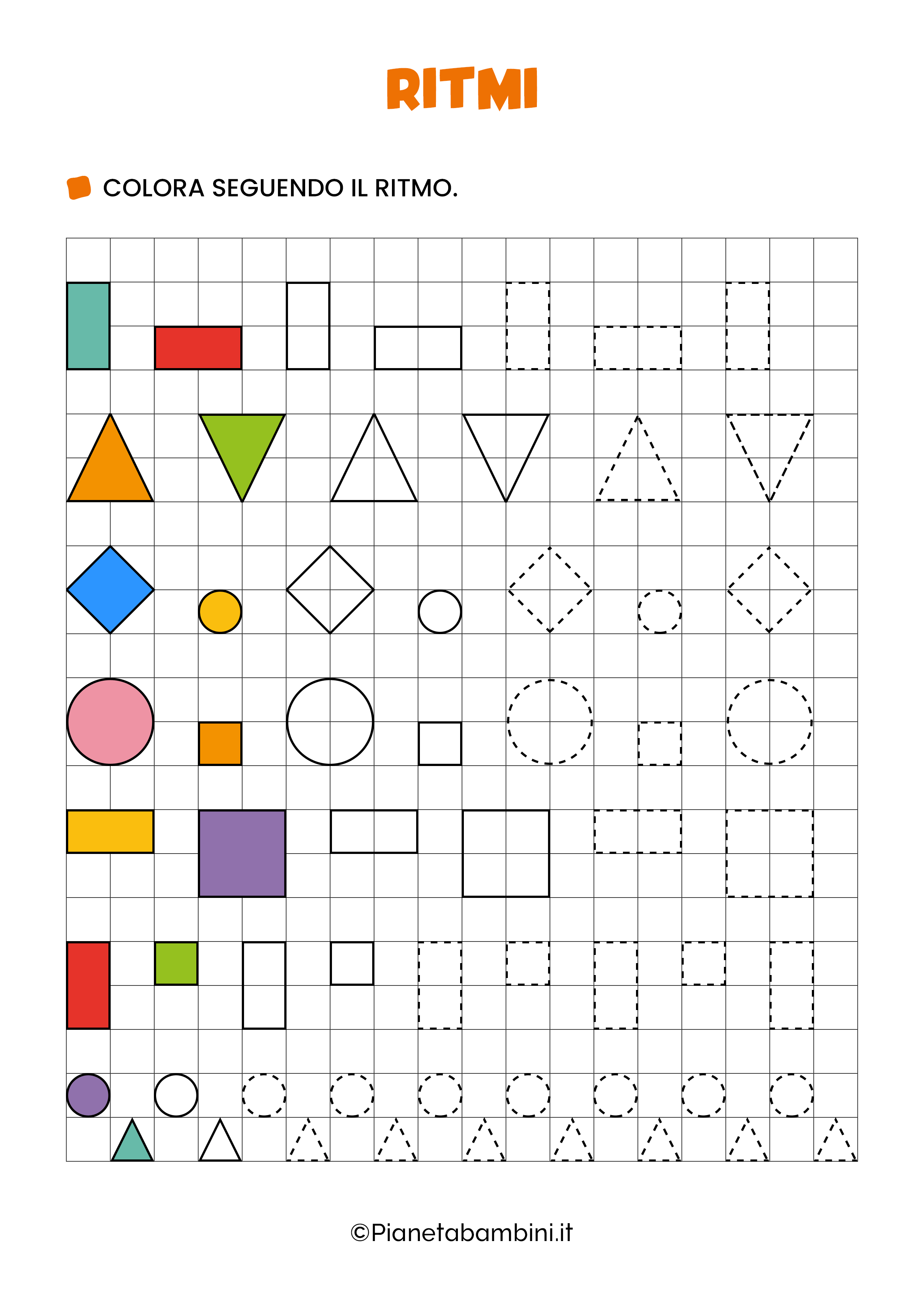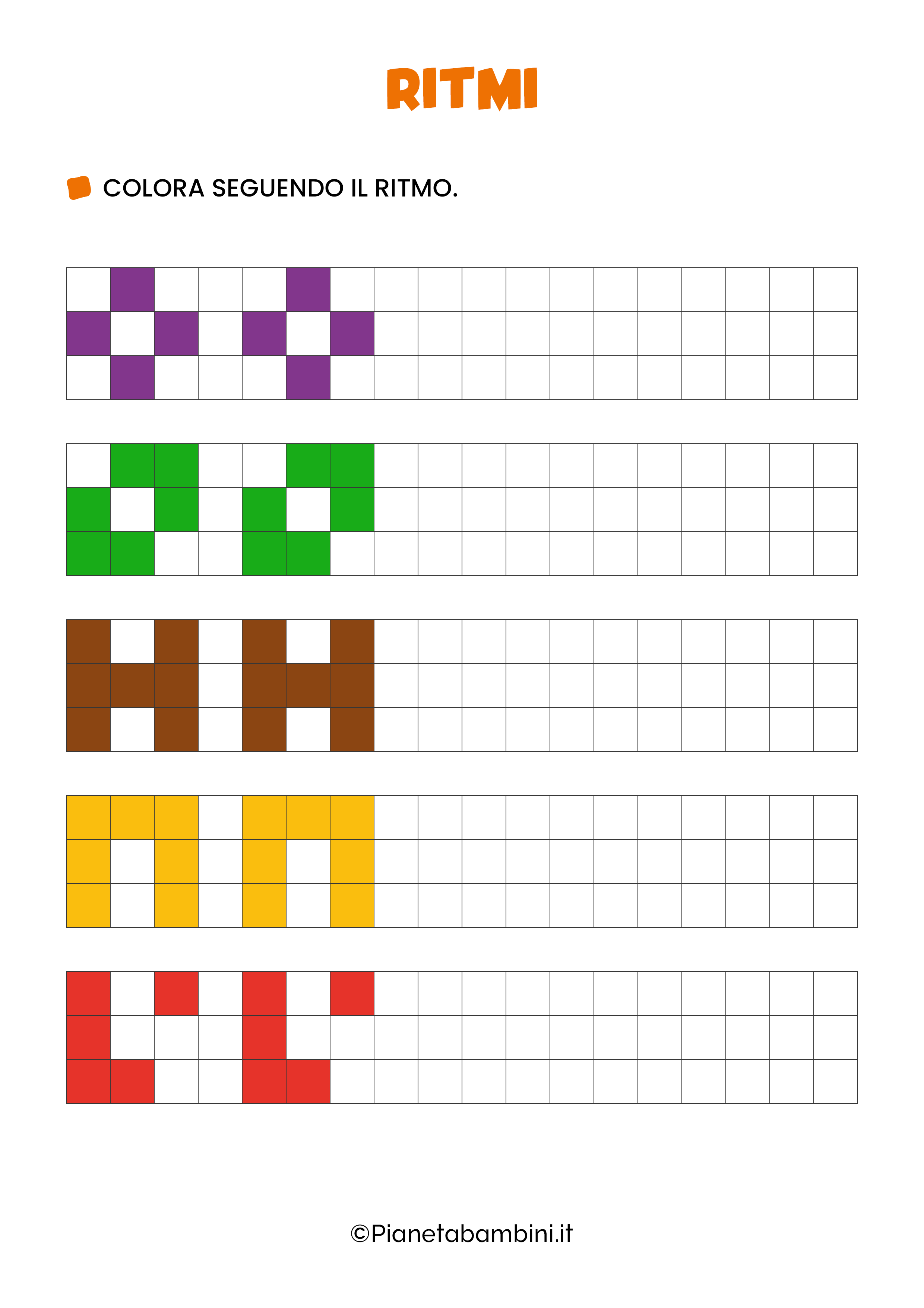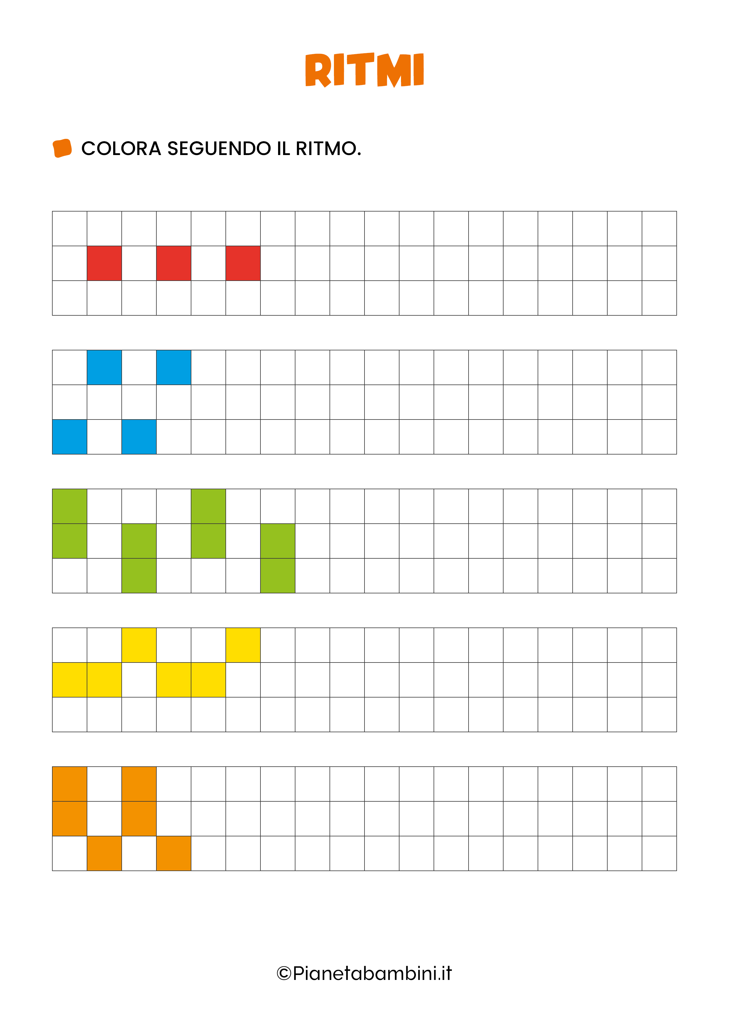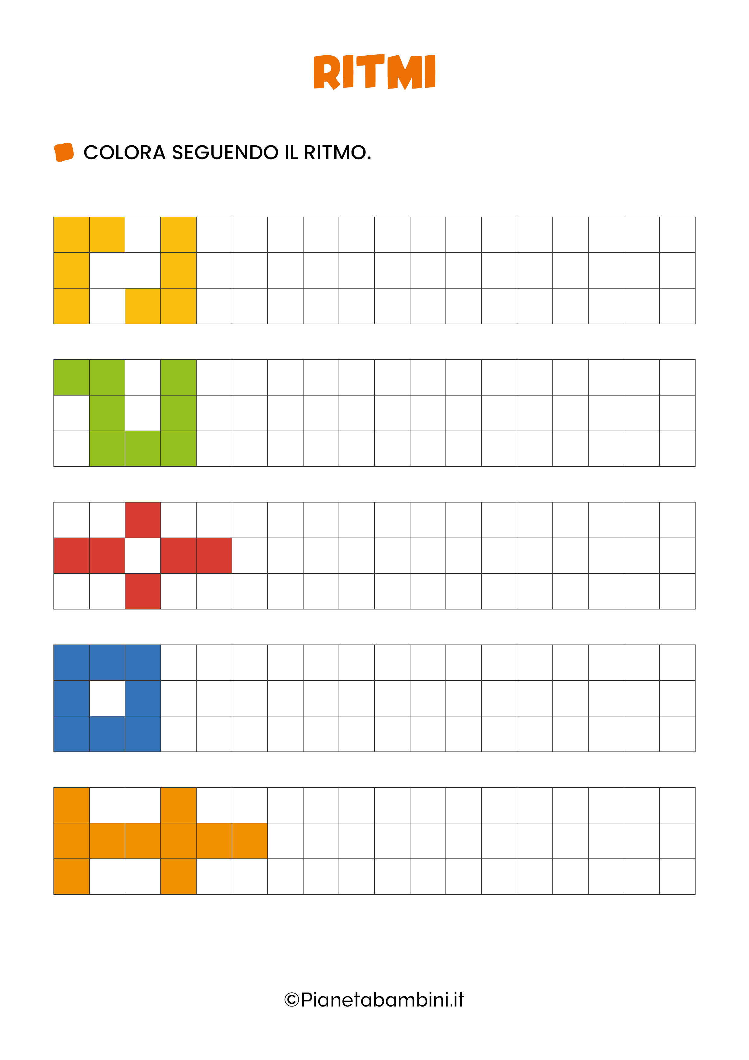 Abbiamo infatti realizzato degli esercizi sviluppati secondo un livello di difficoltà crescente che richiederanno inizialmente di colorare delle tabelle seguendo il ritmo indicato, poi di andare a completare degli schemi di figure inserendo il ritmo mancante e, infine, di disegnare la corretta figura che andrà a completare la sequenza data.