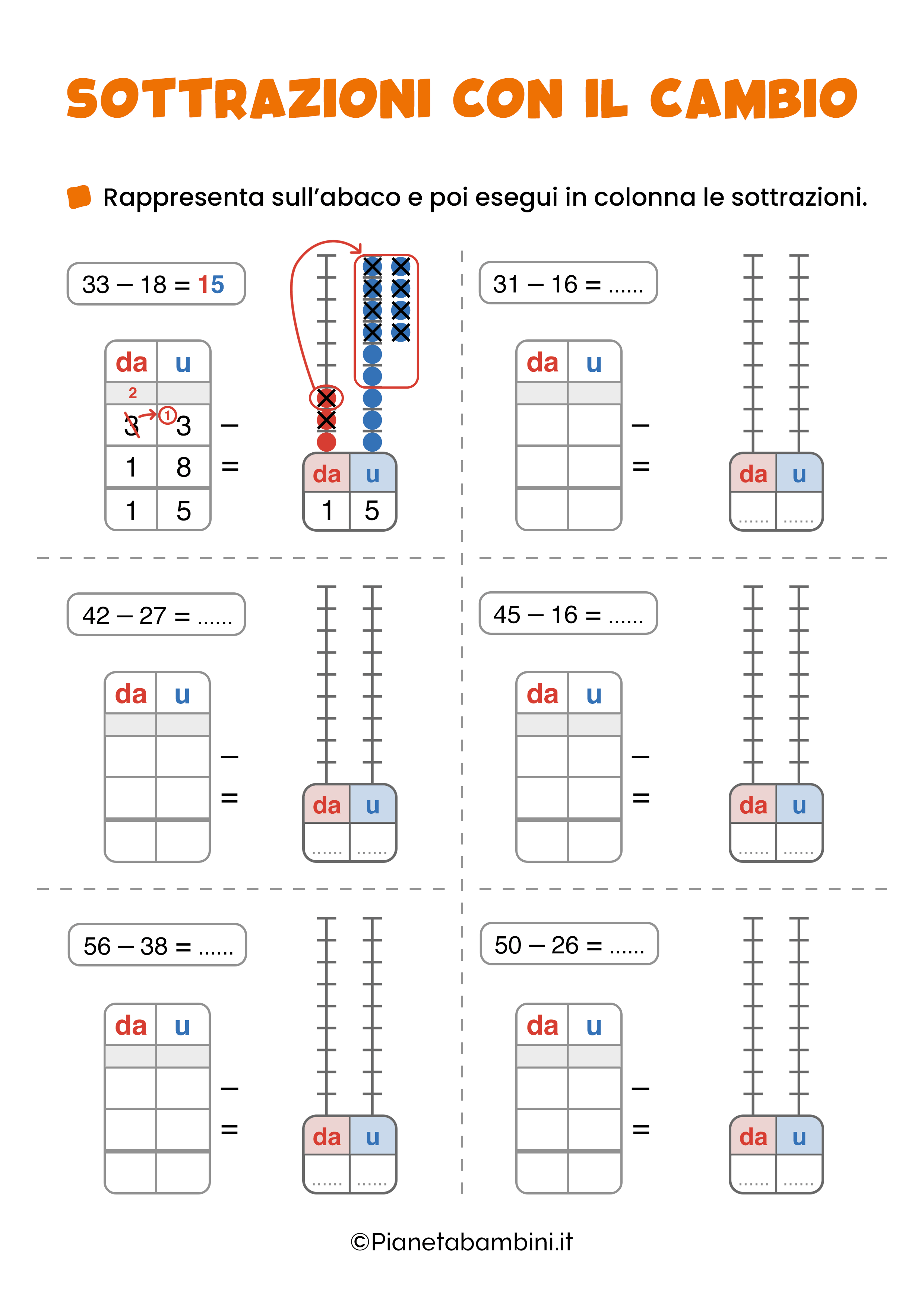Dopo aver imparato a padroneggiare le sottrazioni semplici i bambini saranno in grado di risolvere anche le sottrazioni con il cambio e gli esercizi di matematica che troverete a seguire procedono proprio per grado di difficoltà. Potrete stampare gratis i fogli di esercizi sia tramite i relativi file PDF che singolarmente salvando le immagini sul vostro computer.