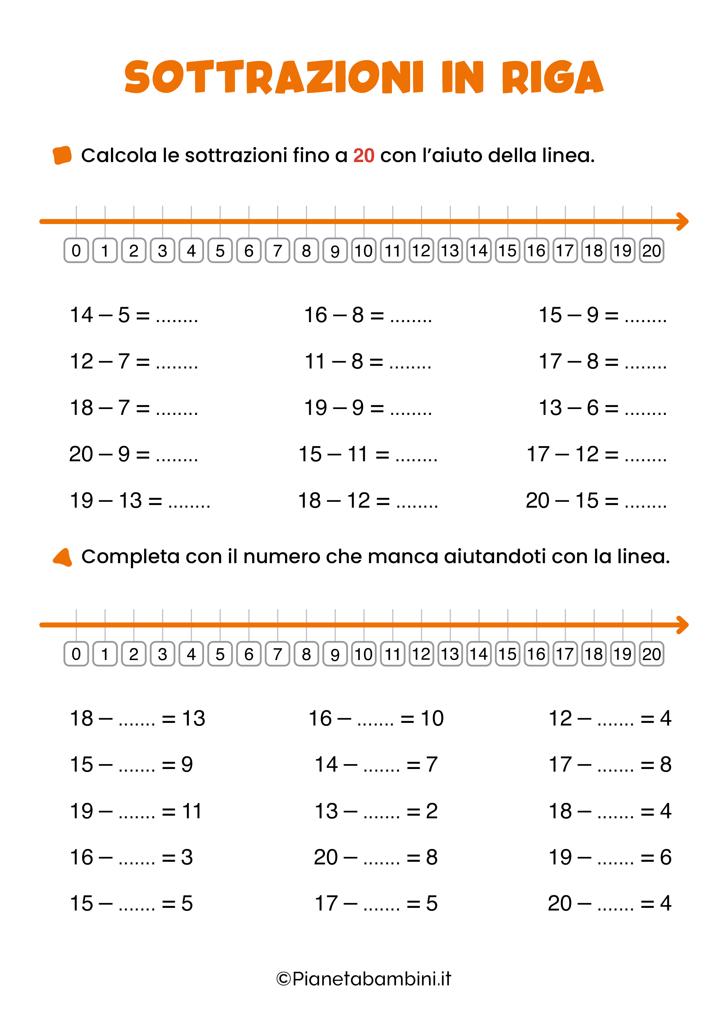 Avete trovato utili i nostri esercizi dedicati alle delle addizioni in riga? Se la risposta è positiva sarete allora felici di scoprire anche le sottrazioni in riga. Anche in questo caso si tratta di operazioni scritte in orizzontale anziché in colonna e aiutano a sviluppare il ragionamento e la velocità di calcolo.