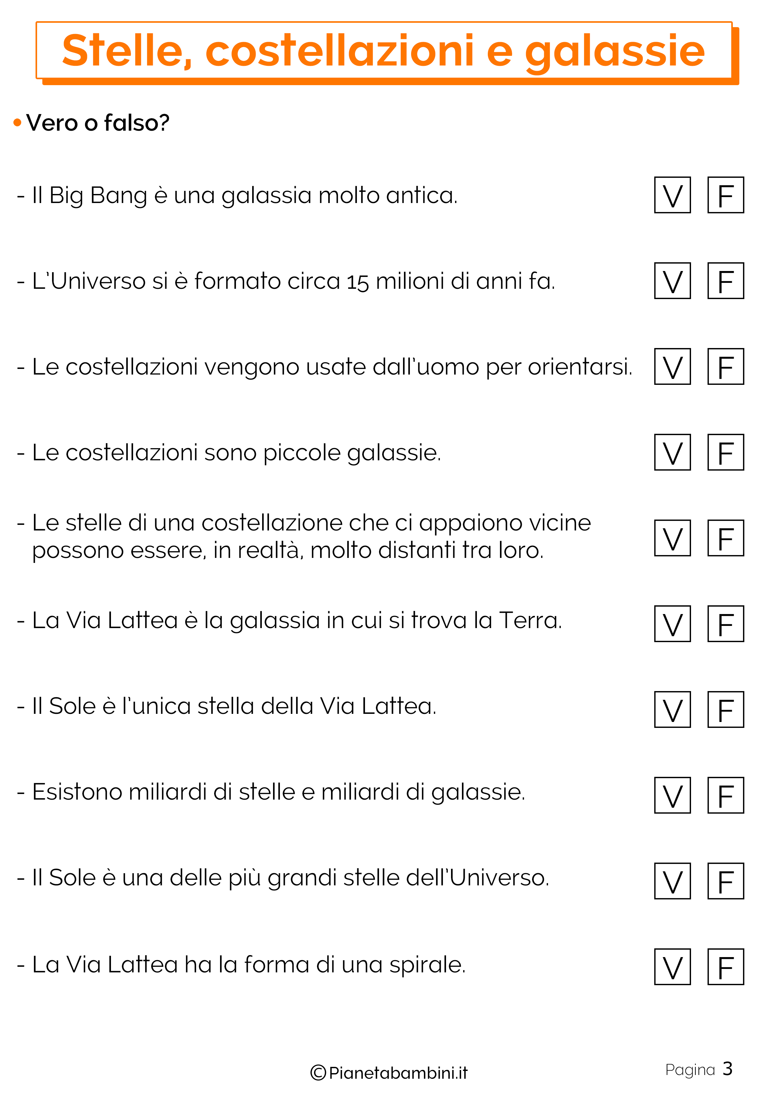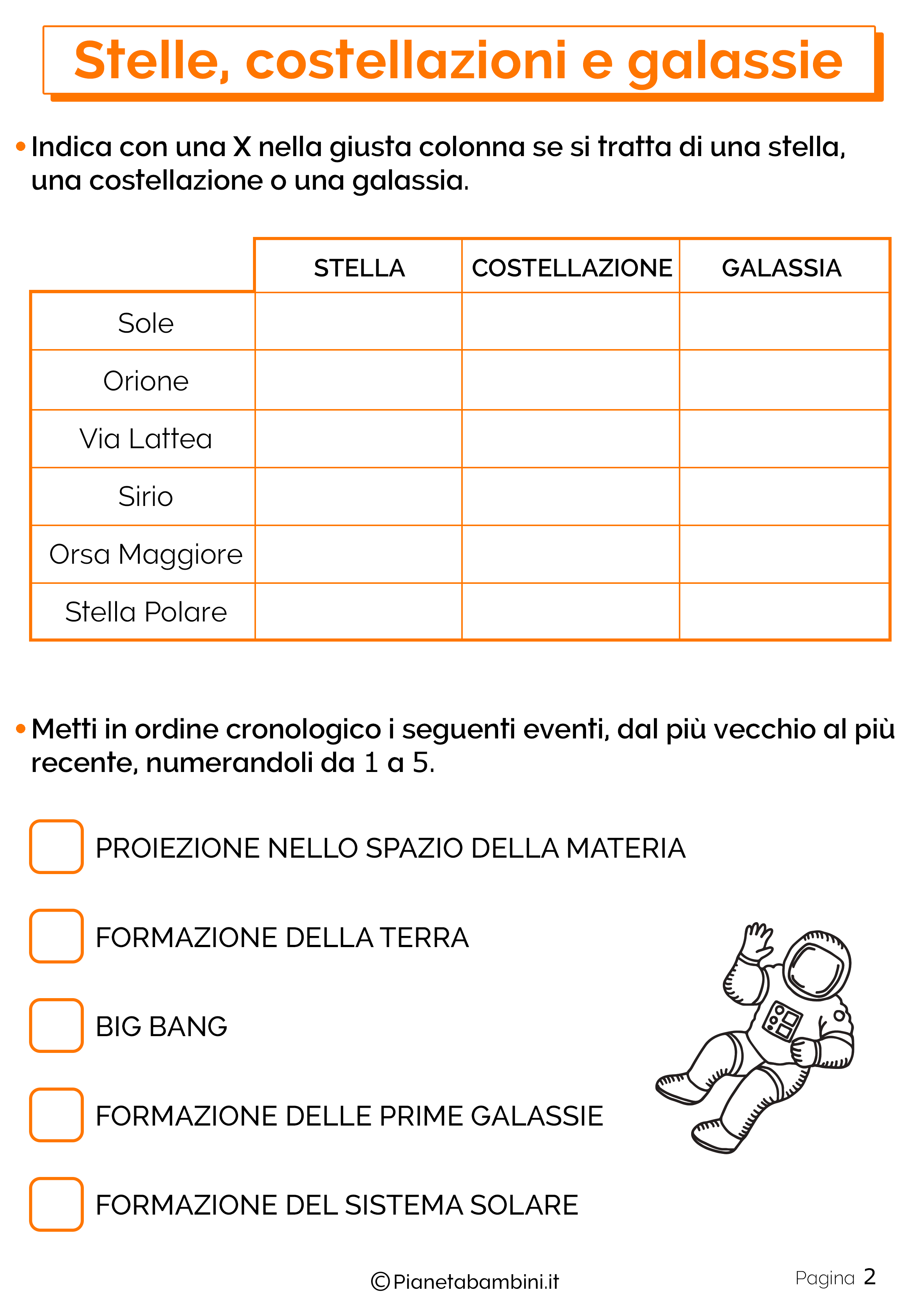 Le tre pagine di schede didattiche ed operative che vi proponiamo per la consultazione online o la stampa gratuita si concentrano proprio sui tre argomenti. Gli studenti dovranno mettere alla prova quanto appreso sulle stelle, ossia i corpi celesti come il Sole che emettono luce e calore grazie ai fenomeni chimici che avvengono al loro interno, sulle costellazioni, gruppi di stelle scelti dagli antichi studiosi del cielo a seconda della loro disposizione, e le galassie, enormi raggruppamenti di stelle come quella a cui apparteniamo, la Via Lattea.