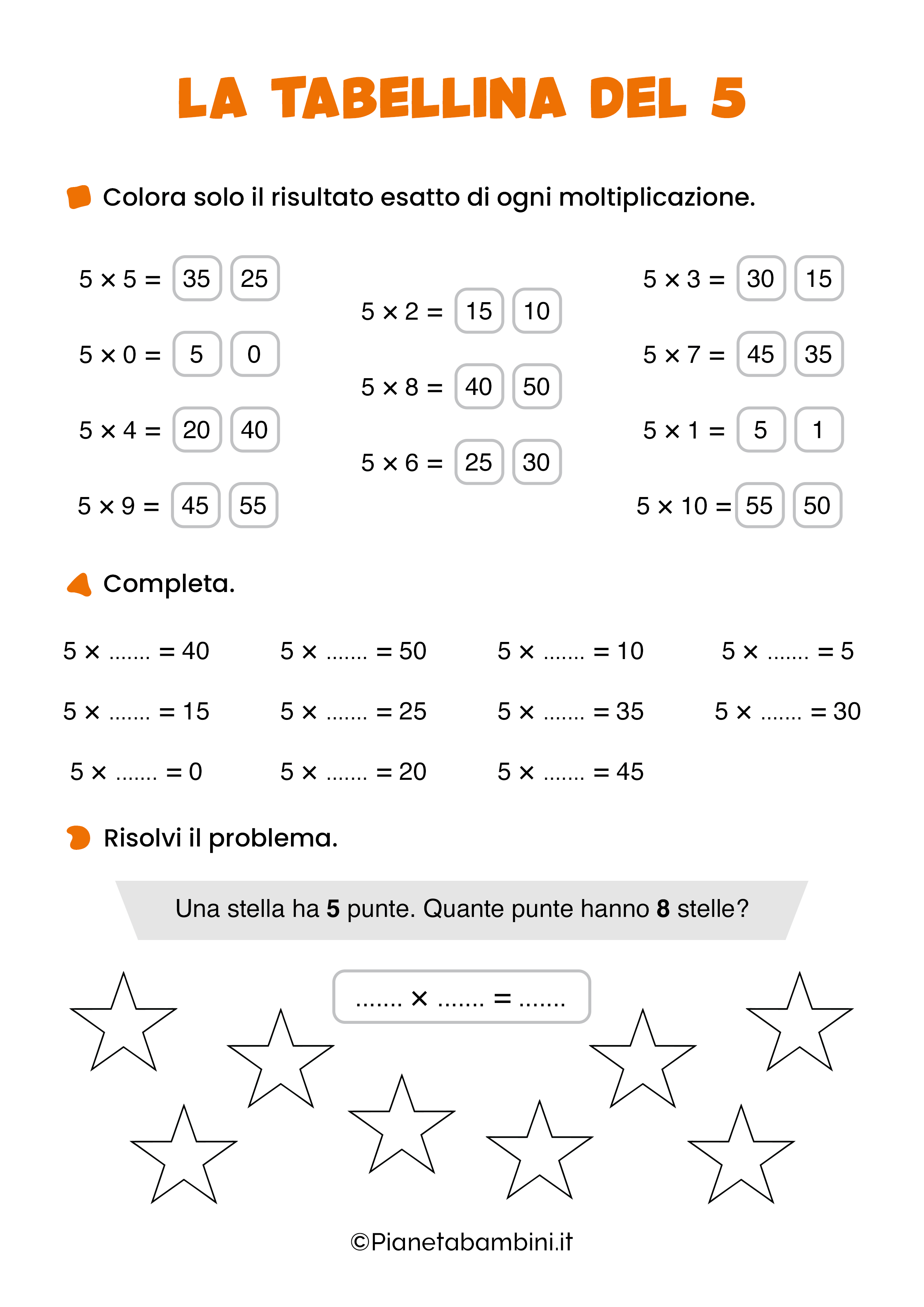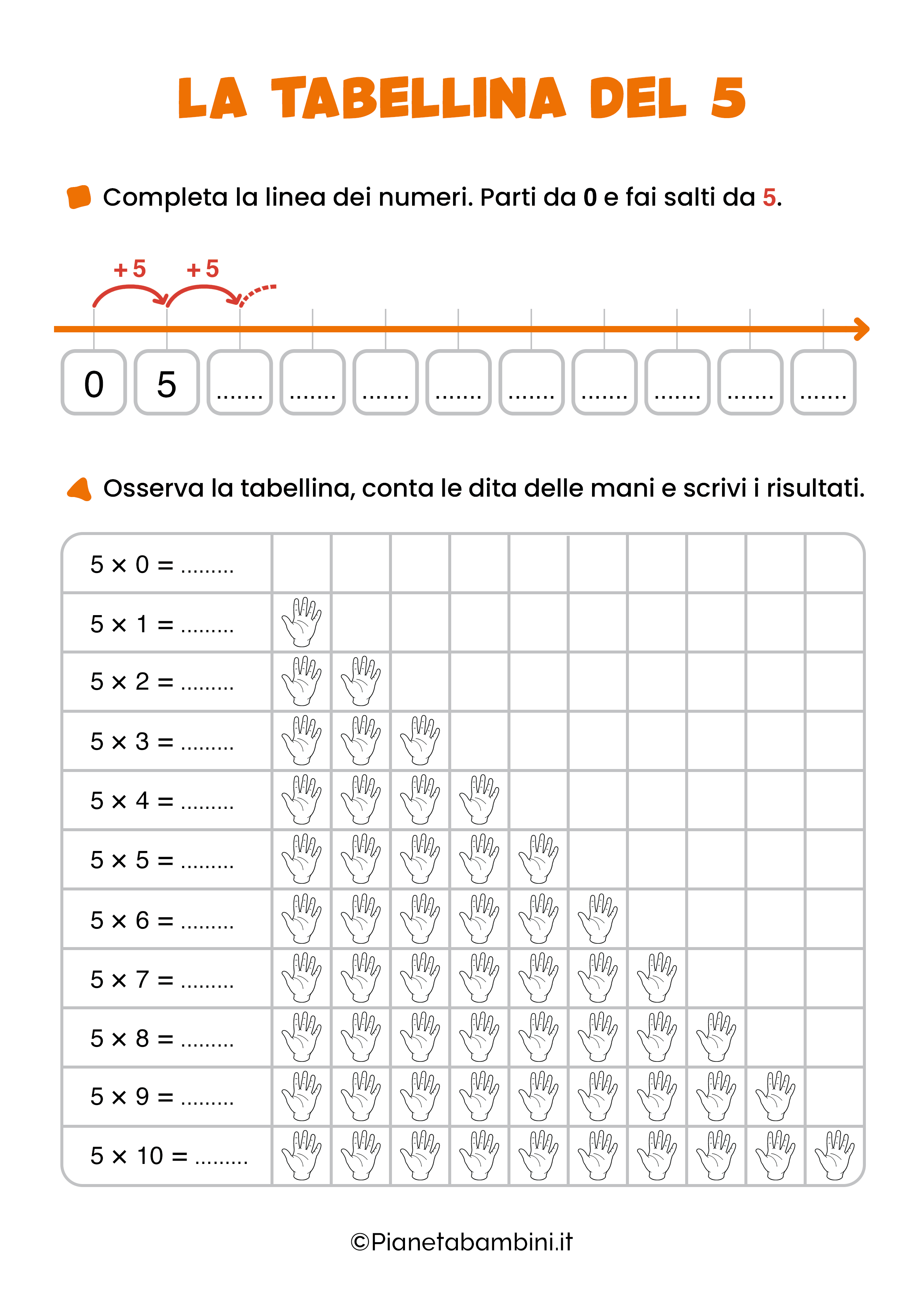 Proposti secondo un livello di difficoltà crescente, e tramite attività che trasformeranno l’apprendimento in un gioco divertente, ecco una serie di esercizi sulla tabellina del 5 che saranno di grande aiuto ai bambini per la sua memorizzazione.