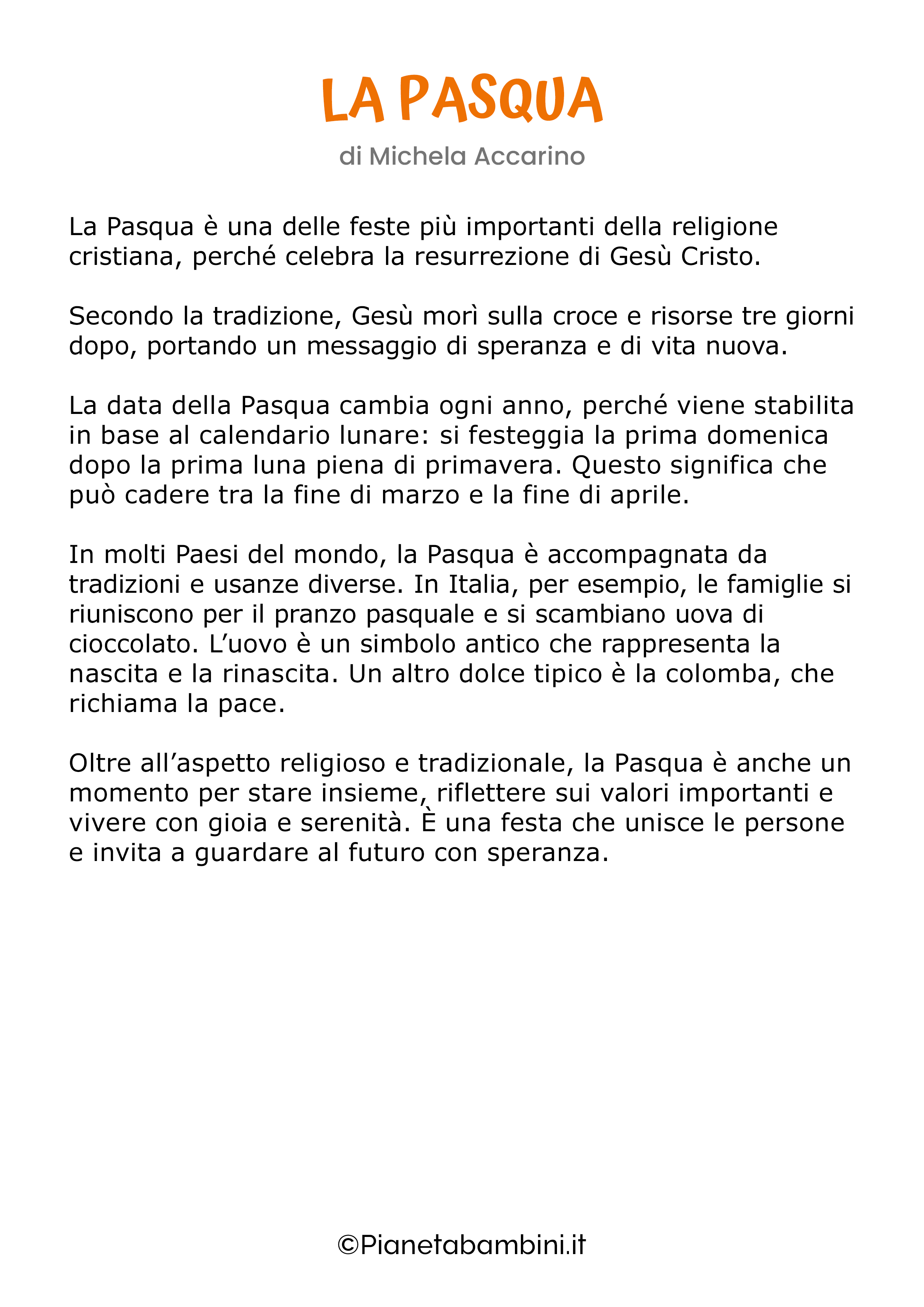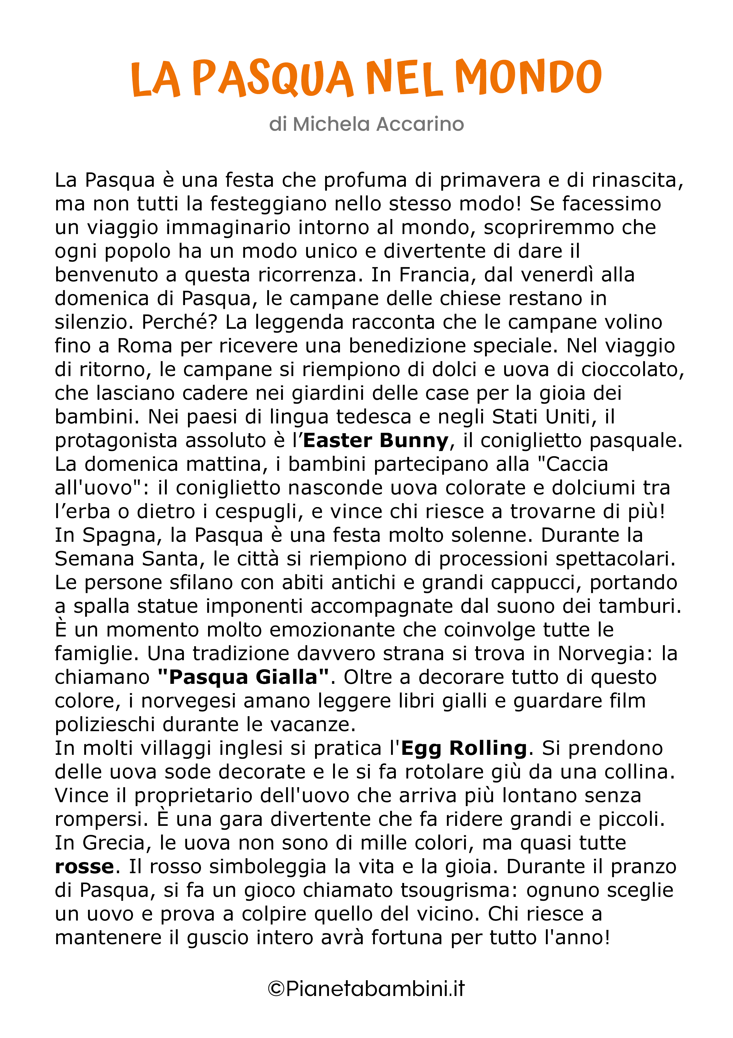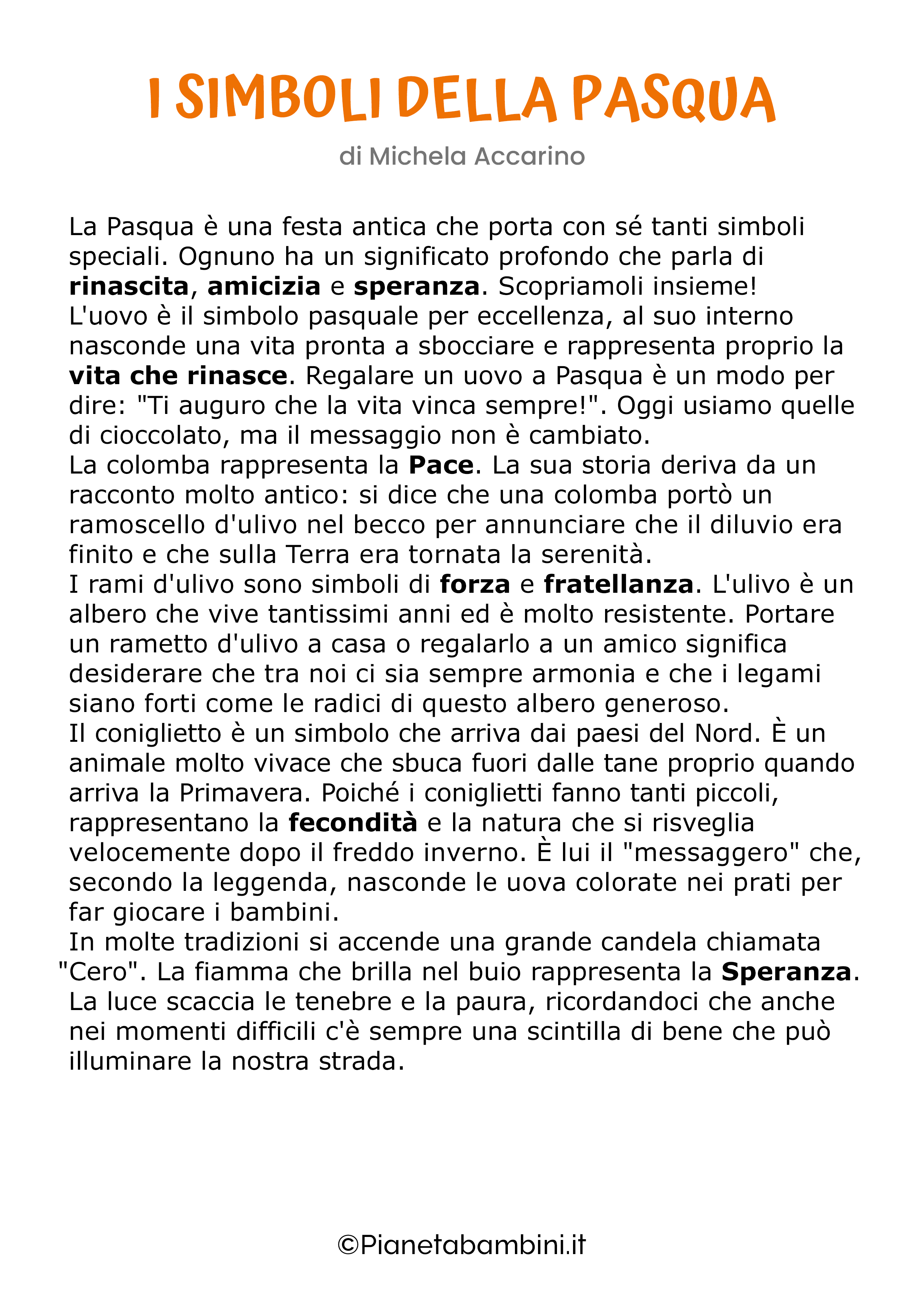 I 22 testi sulla Pasqua, che potrete stampare gratuitamente oppure leggere online in maniera pratica ed in assoluta libertà, spaziano da veri e propri accenni storici sulla festività a racconti prodotti appositamente per bambini e che vedono quindi protagonisti coniglietti, gufetti, leprotti e naturalmente le immancabili uova. Potrete leggere i racconti insieme ai bambini e procedere poi con qualche attività relativa alla comprensione del testo.