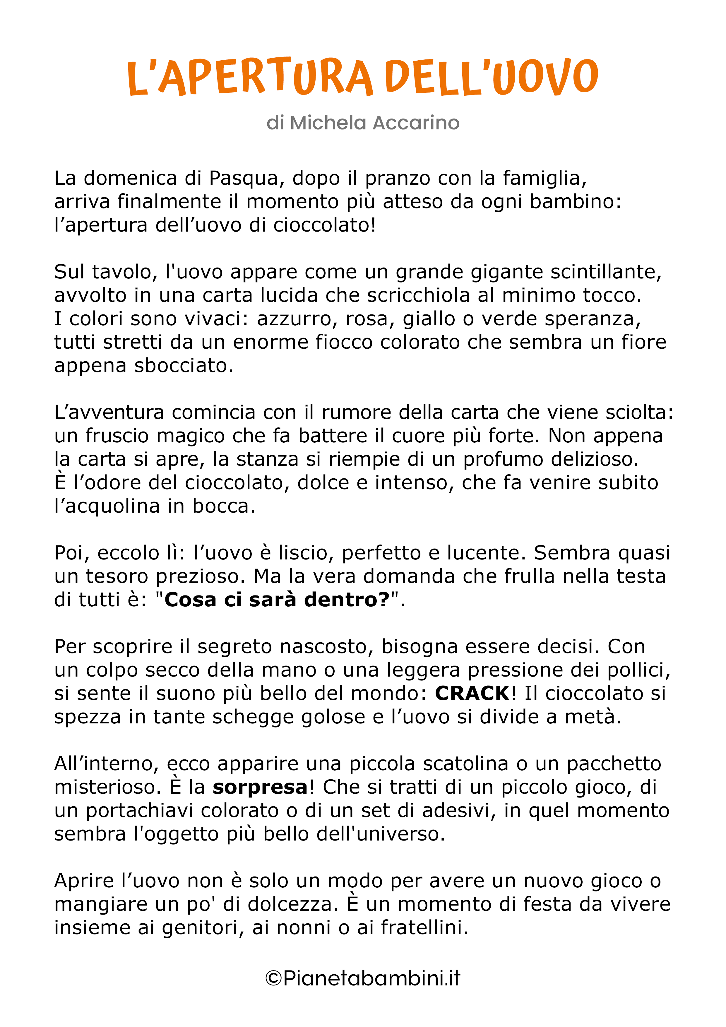 Preparatevi a scoprire una imperdibile raccolta di racconti divertenti e al tempo stesso educativi che immergeranno i vostri bambini nelle magiche atmosfere pasquali… qui vi mettiamo infatti a disposizione ben 22 testi sulla Pasqua perfetti per i piccoli studenti della Scuola Primaria che, tra la creazione di addobbi e lavoretti per la festa, avranno modo di dedicarsi anche alla letteratura ispirata proprio all’evento.